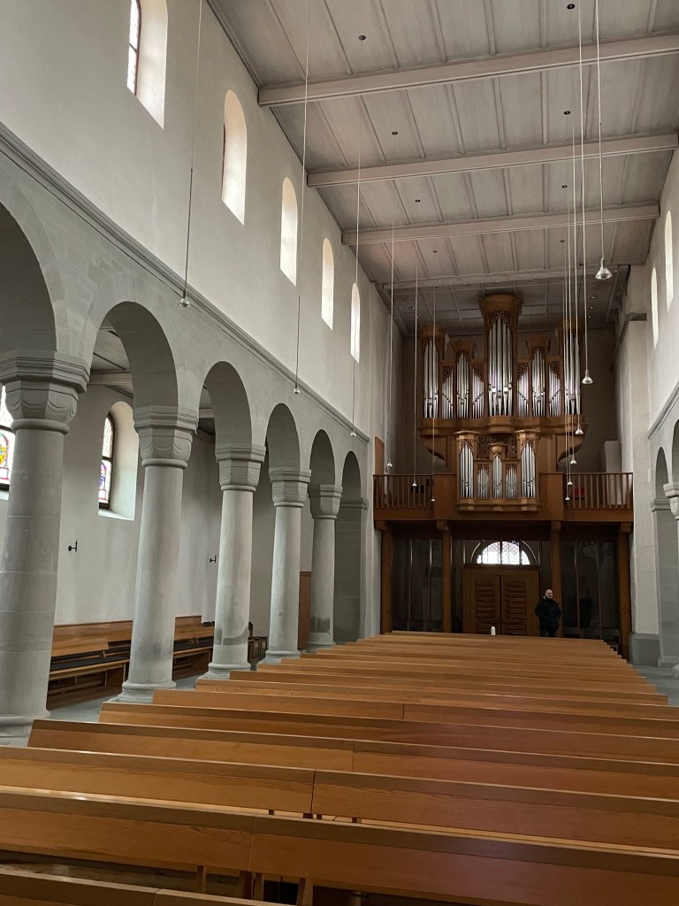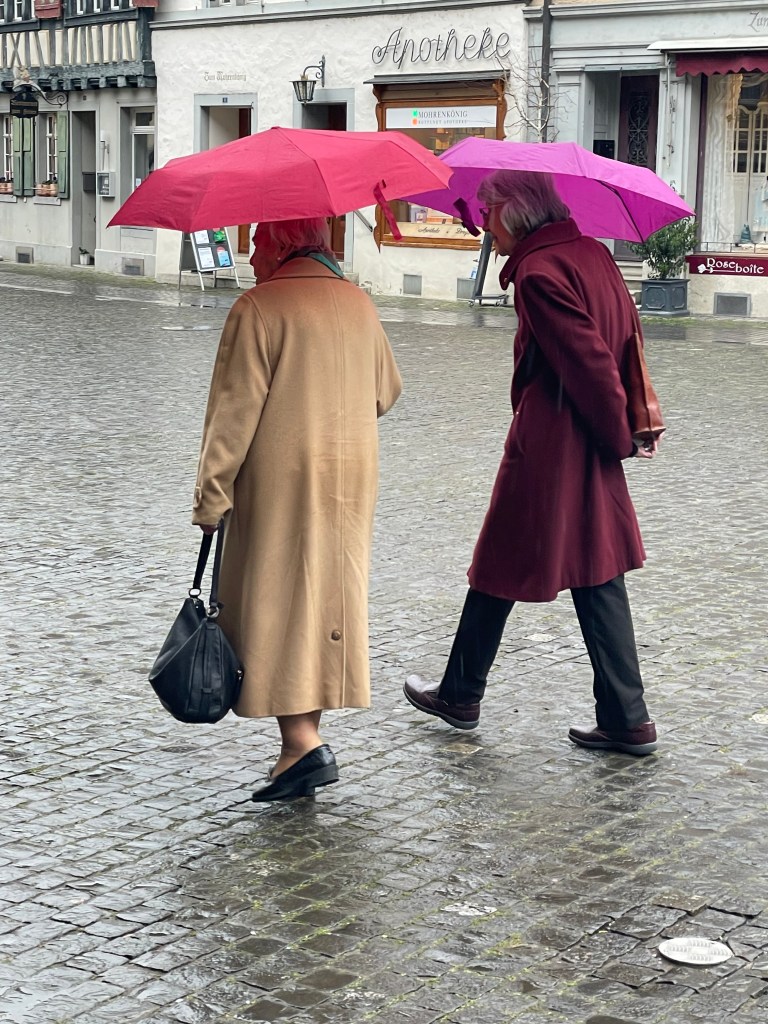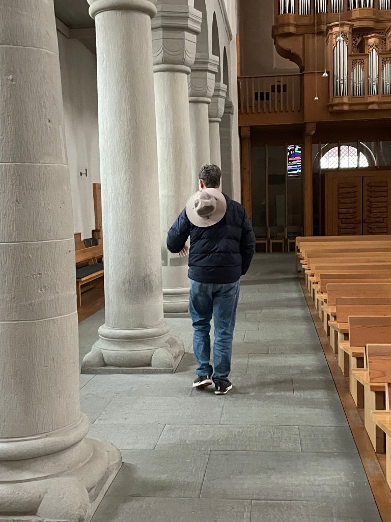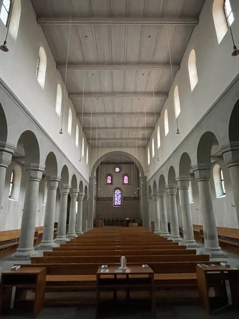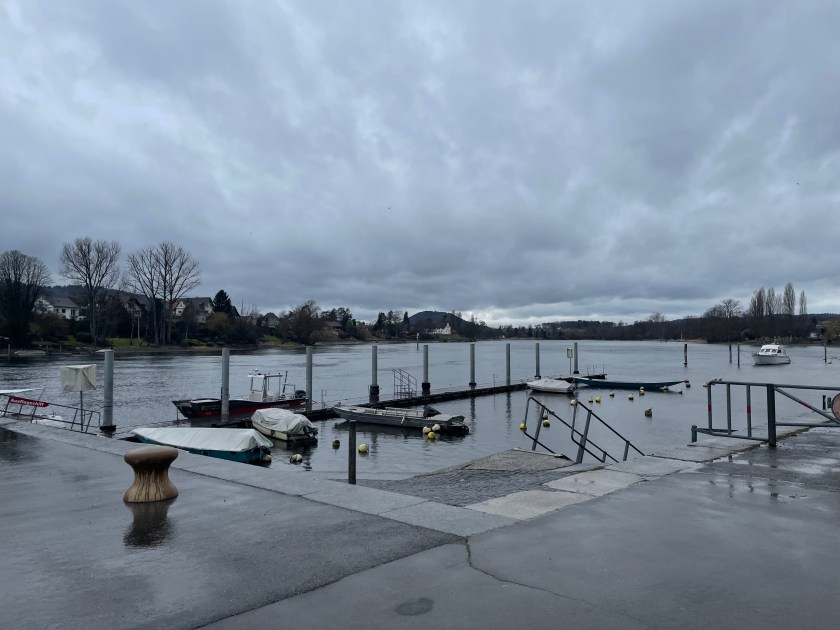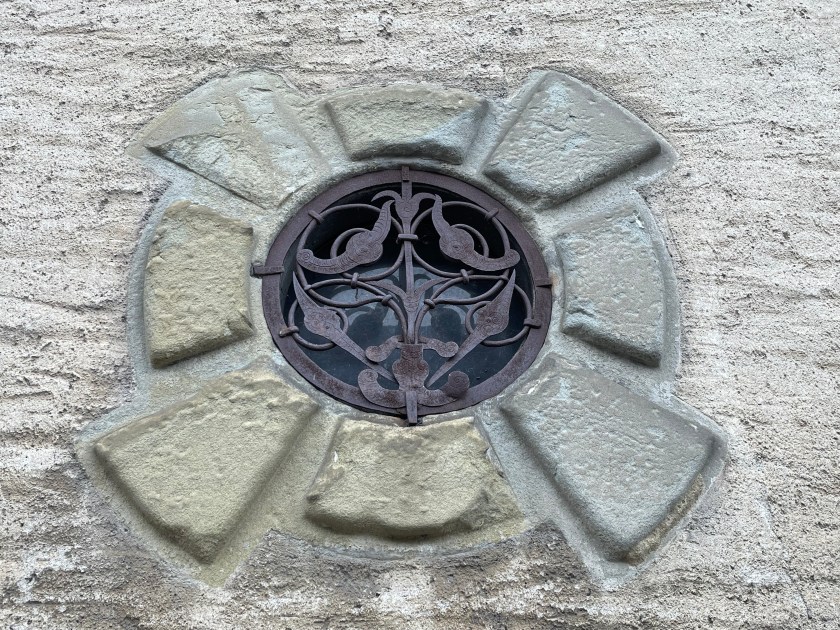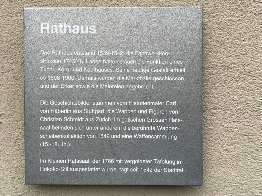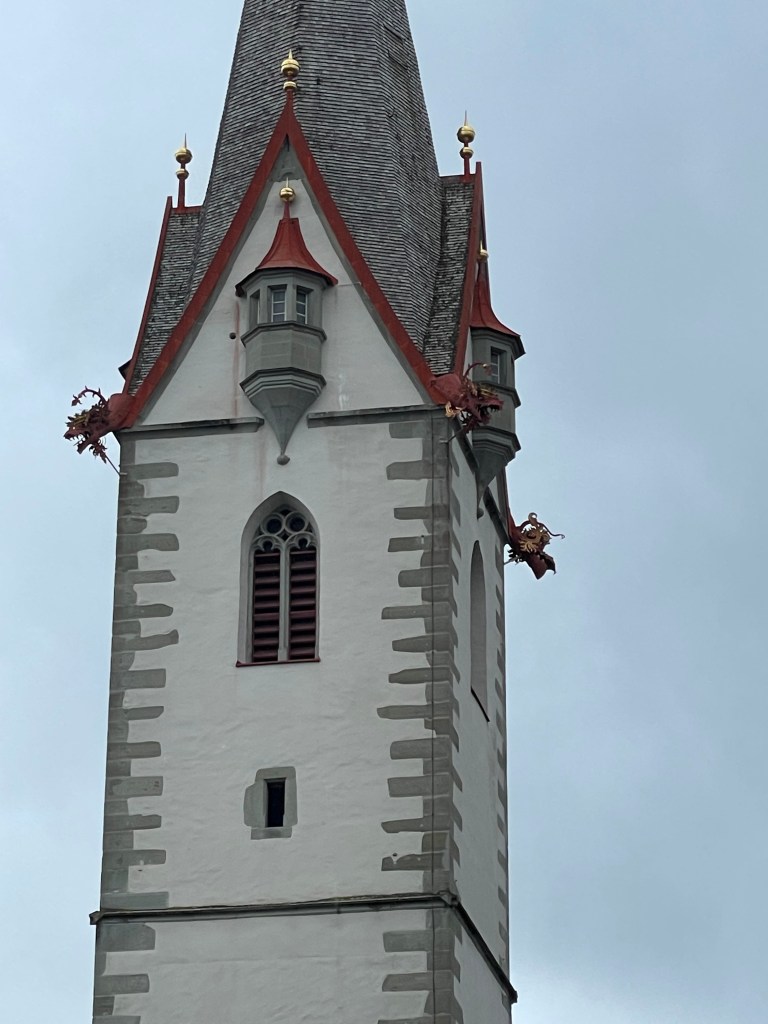 It’s an old town, with lots of murals on the buildings and lots of charm, right on the river. Today was a misty rain day with hardly anyone out and about. Not many shops were open. We found an excellent bakery with fresh plum Kuchen and a raisin bun, and we wandered here for about an hour.