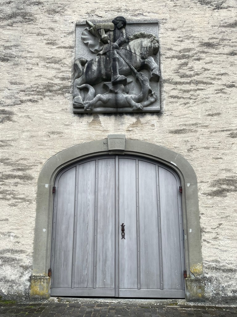 Images of St. George, the knight are found all around the town, and on the manhole covers in the pavements. He is conquering the dragon.