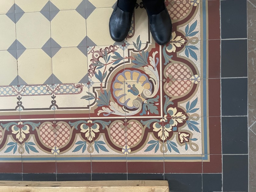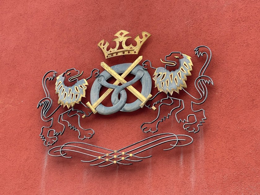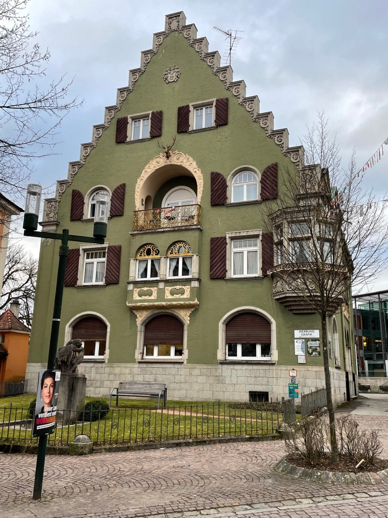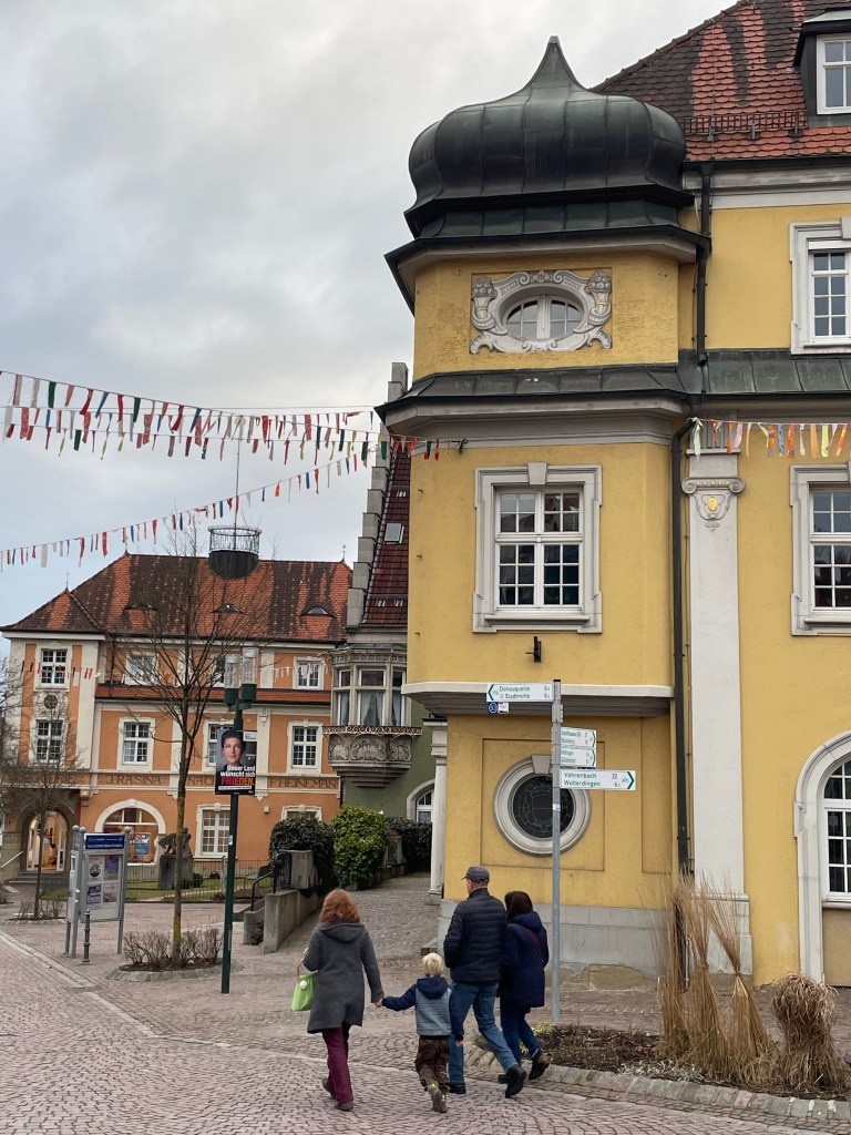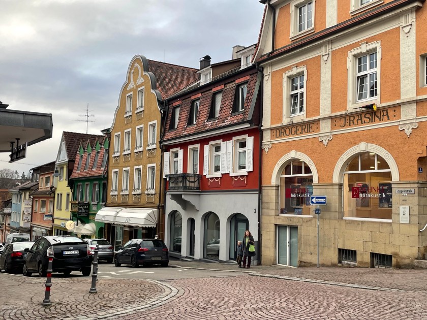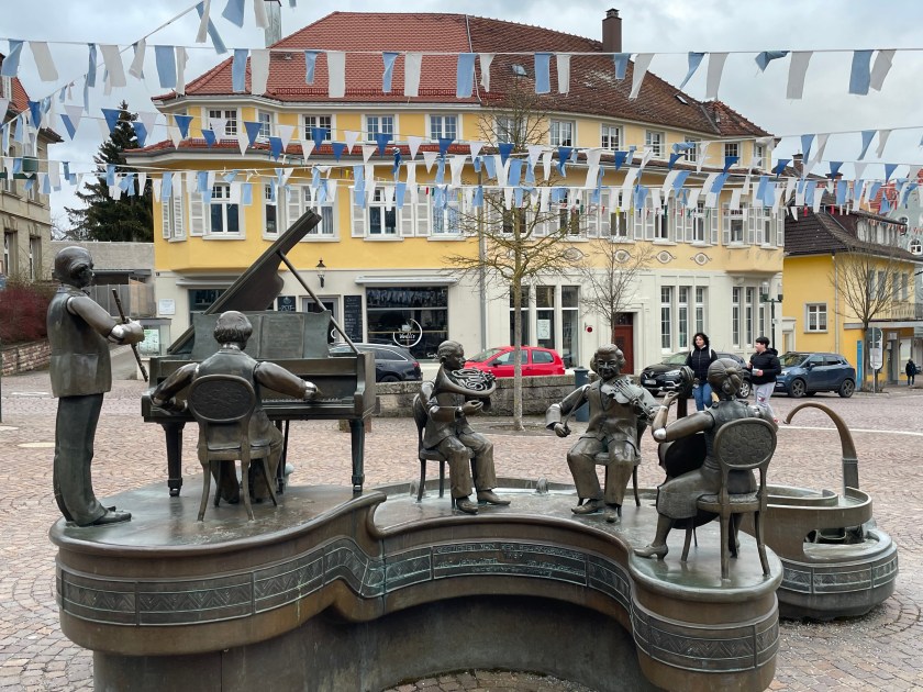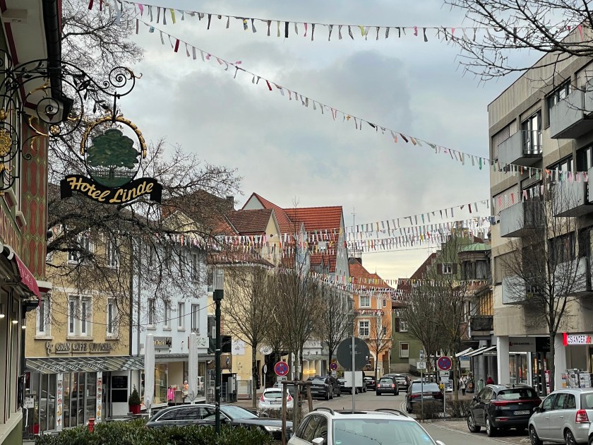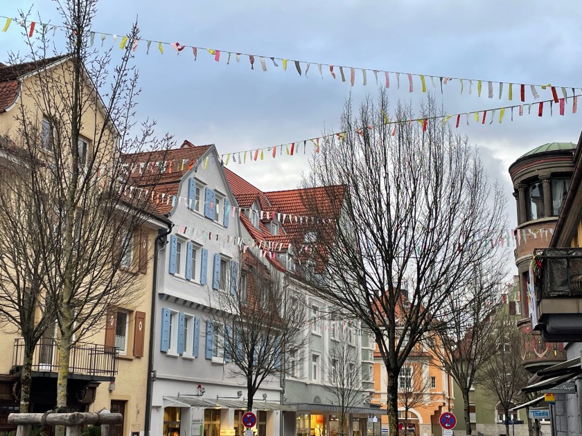 We stopped at the Tourist Info office and got a walking map and took a walk around town. Everyone here in these towns is setting up for Karnival or Fasnacht/Fasnet. There are banners hanging in all the towns, draped back and forth across the streets. Fabric strips about 3-4″ wide by about 12″ long hang from the banners/ropes and decorate streets everywhere. Town squares are also criss-crossed with these hanging banners of fabrics.