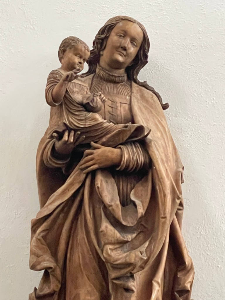 Inside the church is a beautiful life-sized 500 year-old wood carved Madonna and Child sculpture.