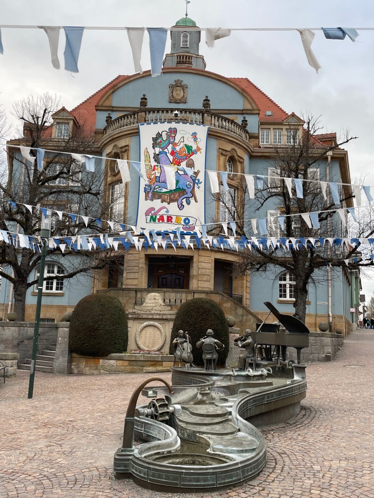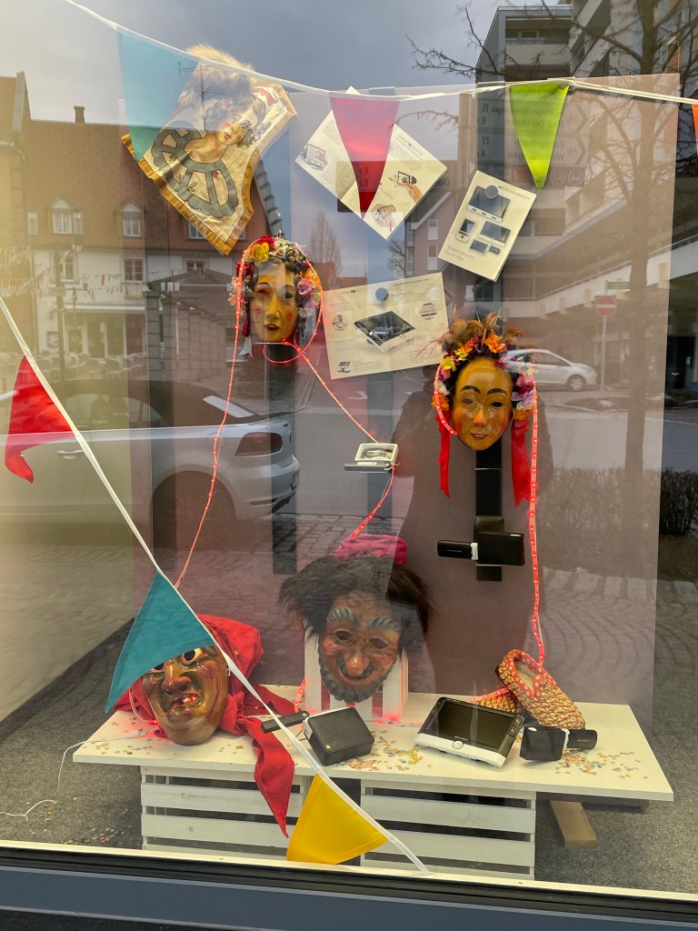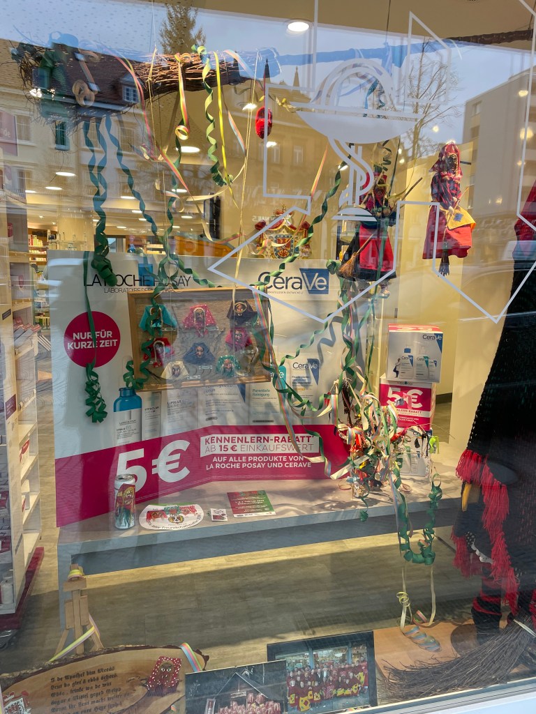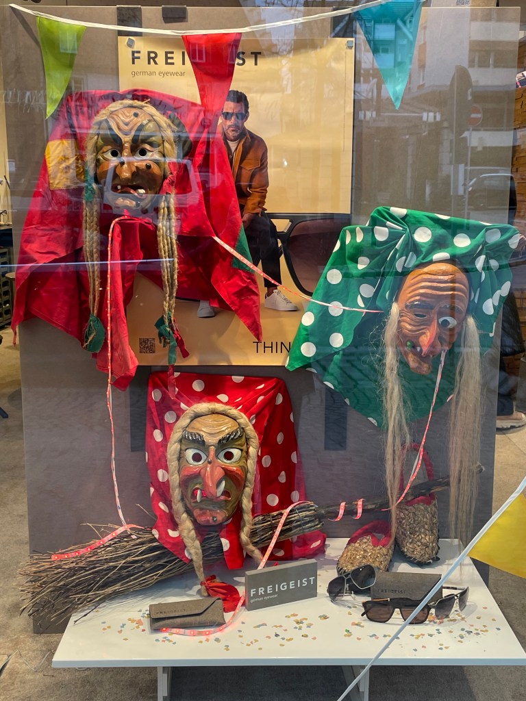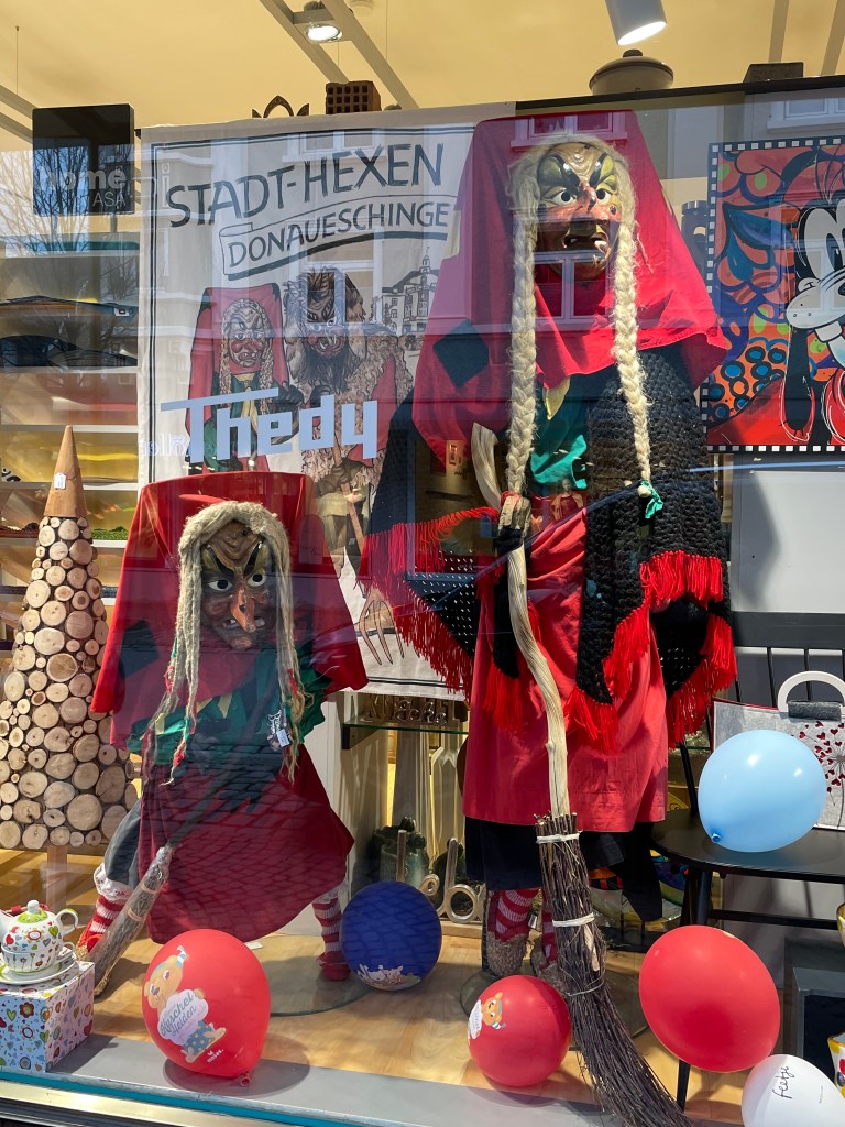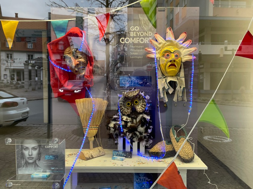 The Fastnacht theme here seems to be “the Fool, or “Narro.” The German word for fool is Narr. Shop windows are filled with scary masks and costume faces and witches and fools. The celebrations begin this week. It’s as big as Halloween at home with lots of masks and costumes and fun.