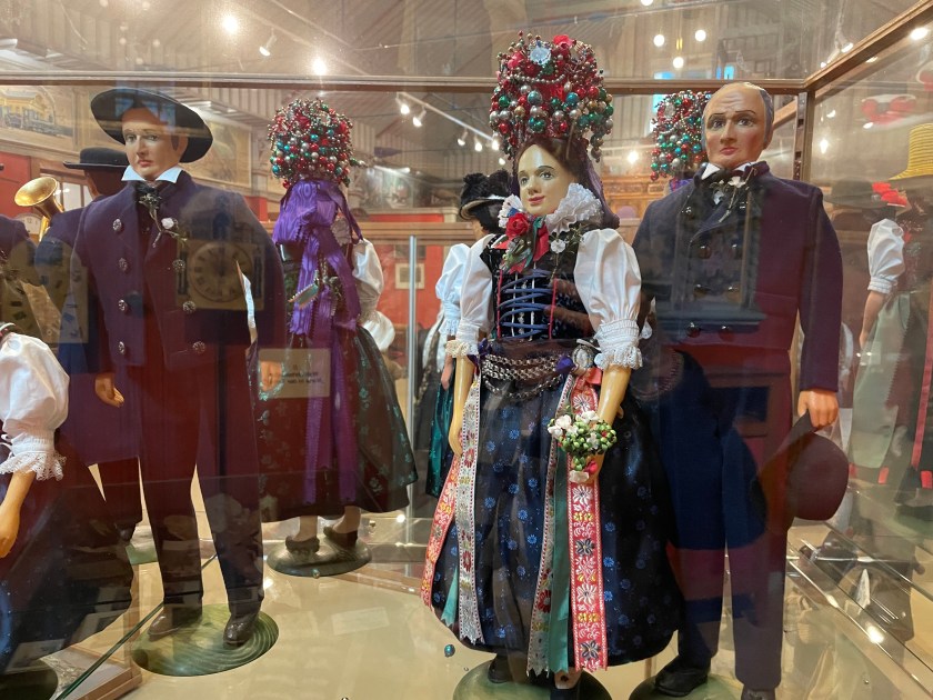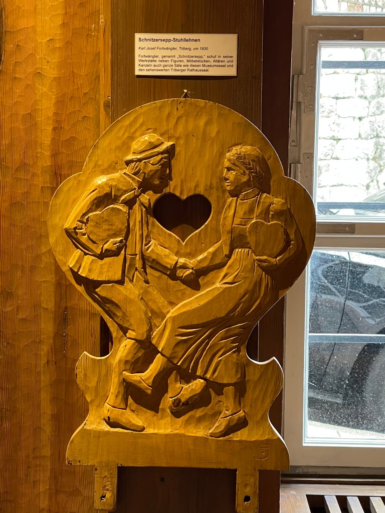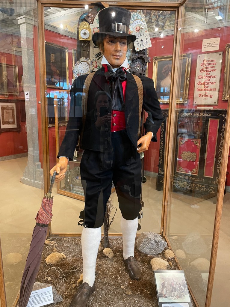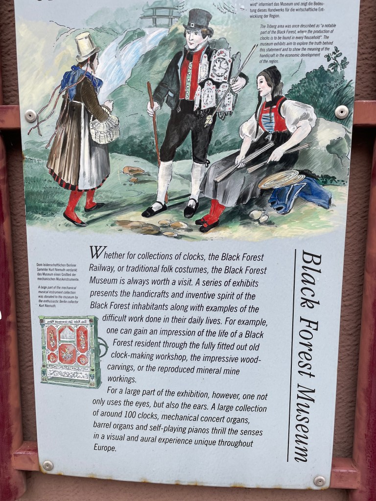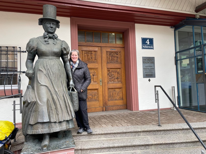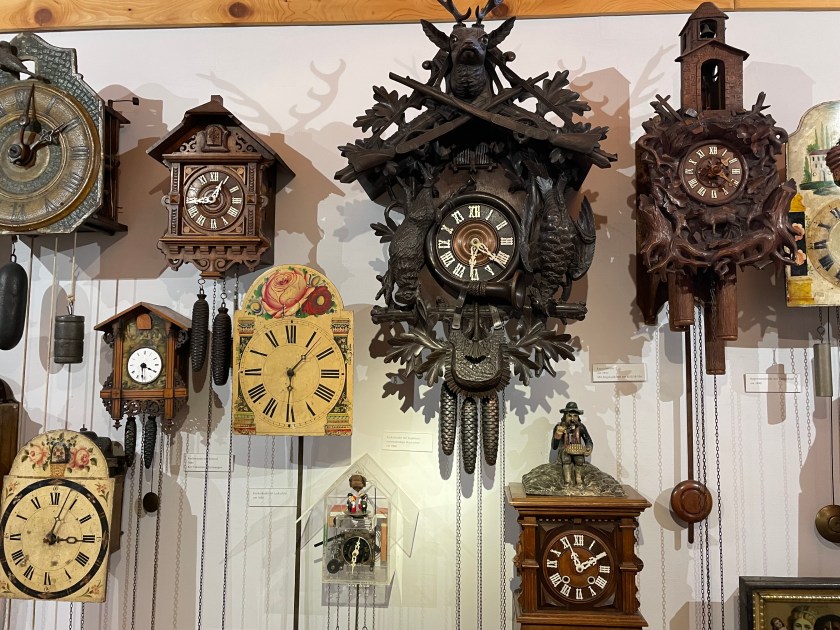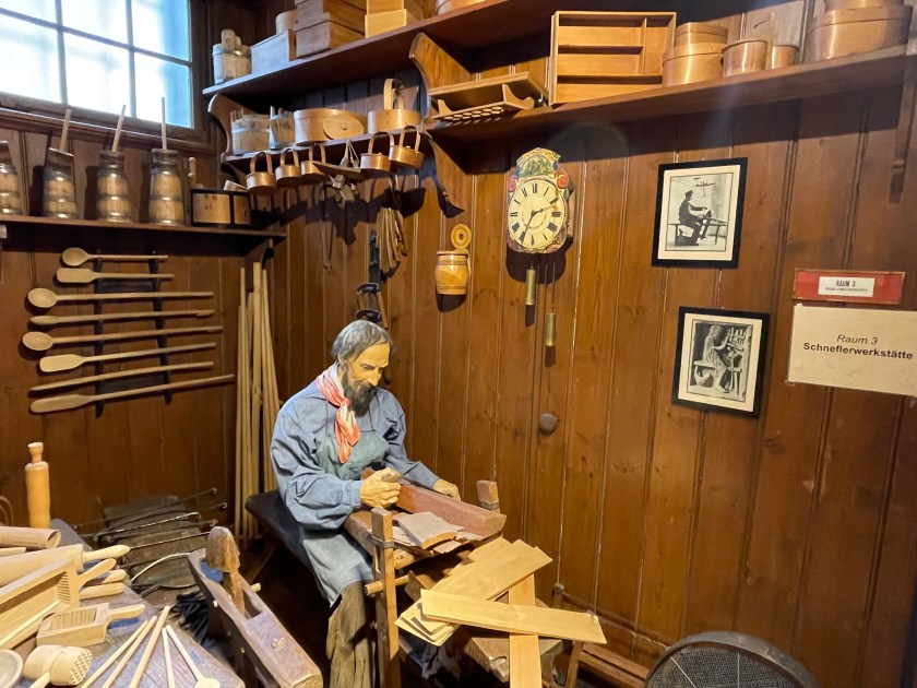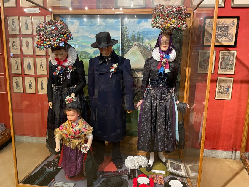 We first went to the Schwarzwald Museum by the Tourist Office. We spent about an hour in the museum and it was Wonderful. Lots of good German Black Forest history. We saw traditional clothing, celebration clothing, and house wares. The museum was filled with beautiful wood carvings and carved furniture. Some rooms in the (house) were set up as they would have been–with straw weaving, watch making, wood carving, and a typical bedroom. We loved it all.