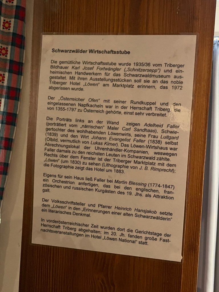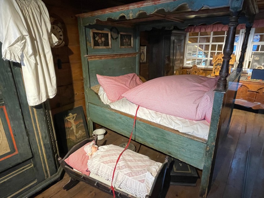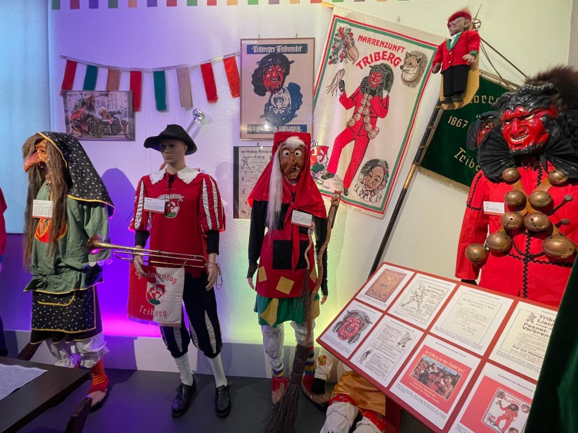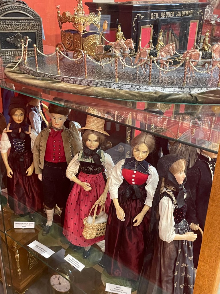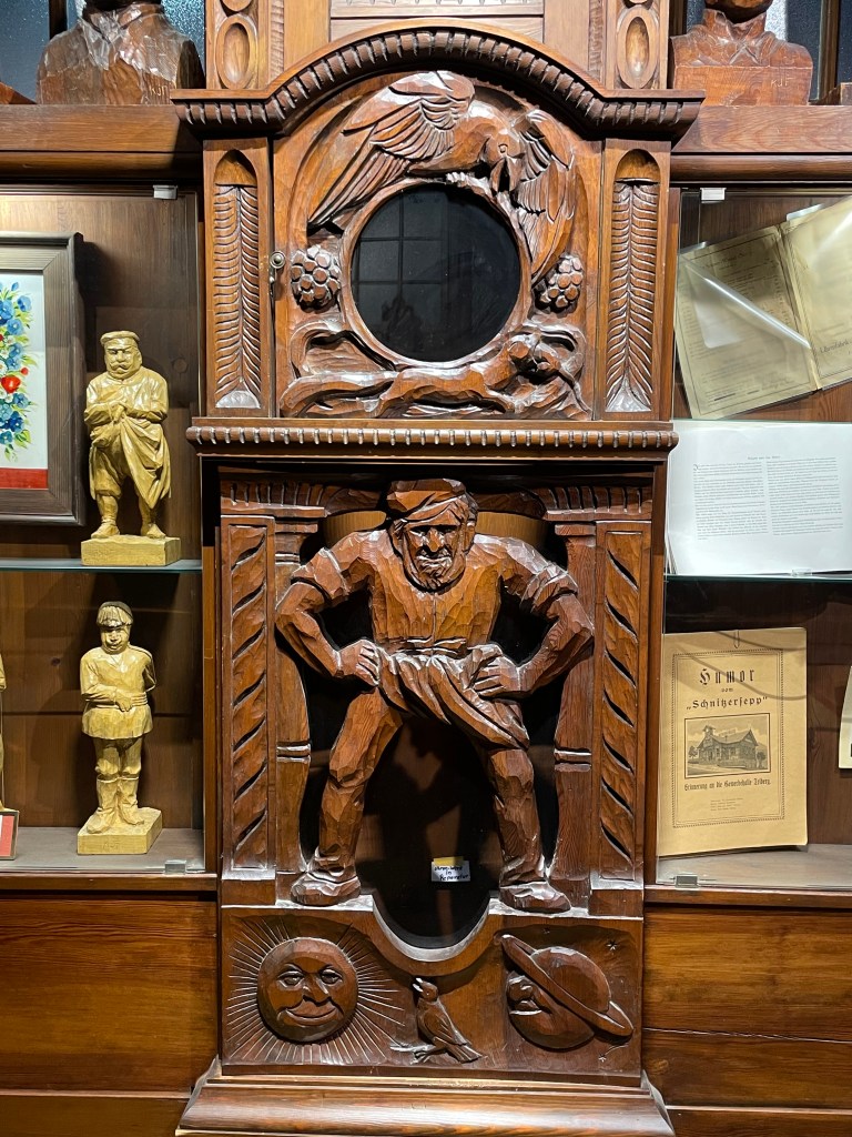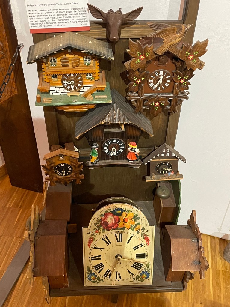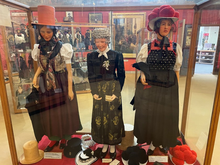 We first went to the Schwarzwald Museum by the Tourist Office. We spent about an hour in the museum and it was Wonderful. Lots of good German Black Forest history. We saw traditional clothing, celebration clothing, and house wares. The museum was filled with beautiful wood carvings and carved furniture. Some rooms in the (house) were set up as they would have been–with straw weaving, watch making, wood carving, and a typical bedroom. We loved it all.