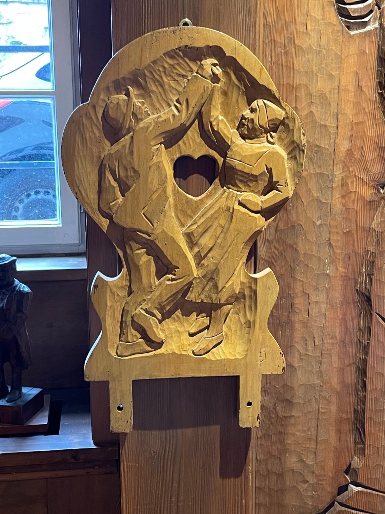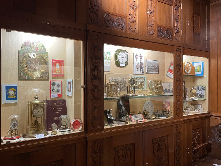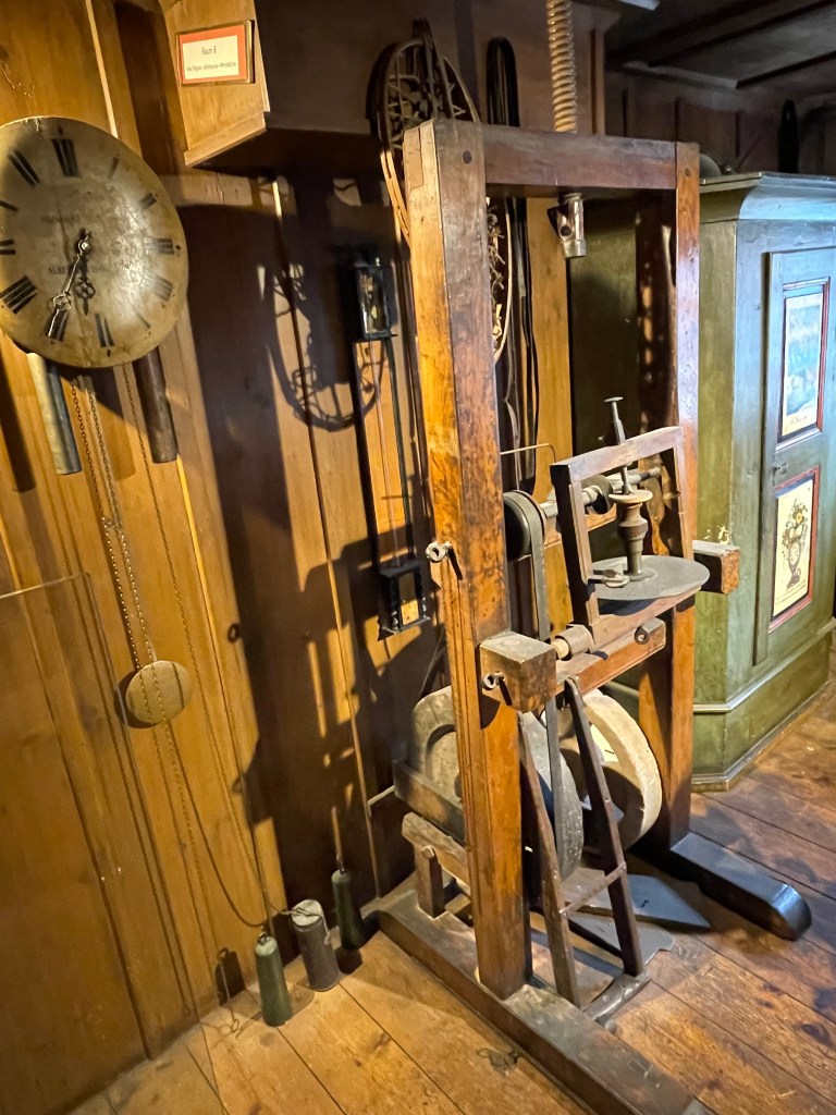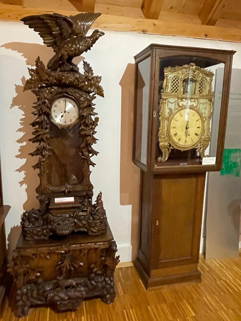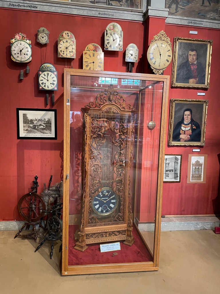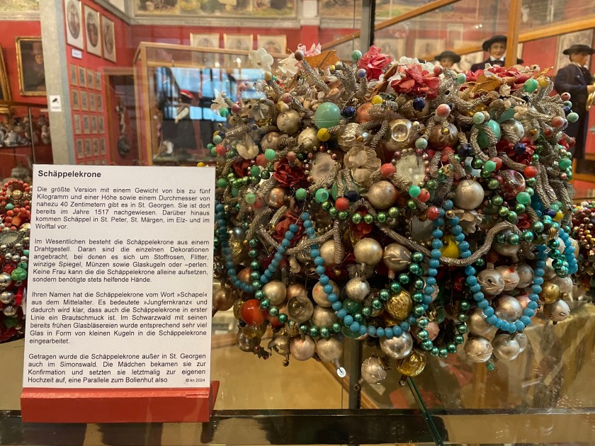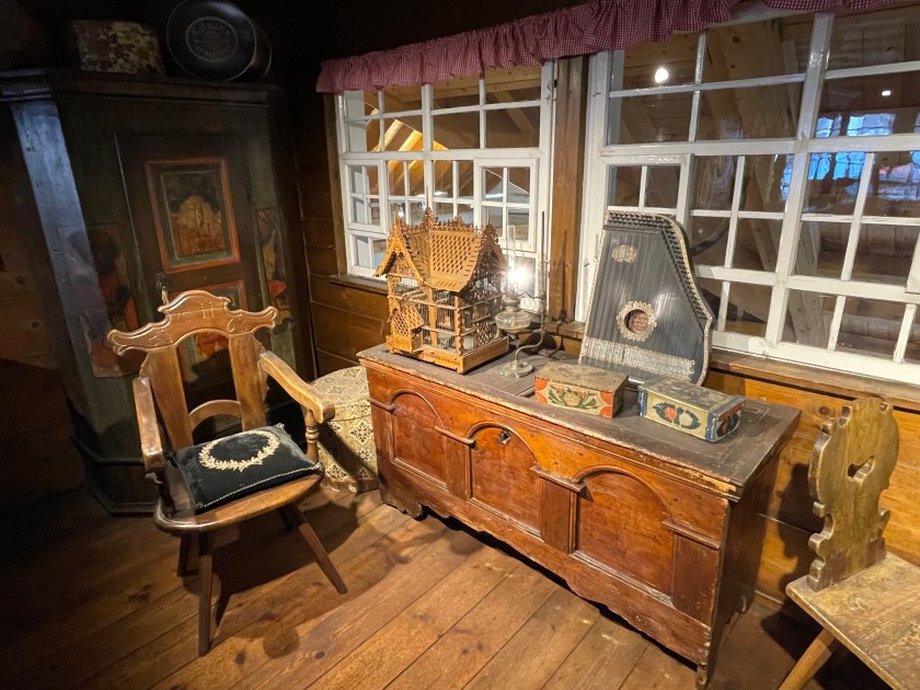 We first went to the Schwarzwald Museum by the Tourist Office. We spent about an hour in the museum and it was Wonderful. Lots of good German Black Forest history. We saw traditional clothing, celebration clothing, and house wares. The museum was filled with beautiful wood carvings and carved furniture. Some rooms in the (house) were set up as they would have been–with straw weaving, watch making, wood carving, and a typical bedroom. We loved it all.