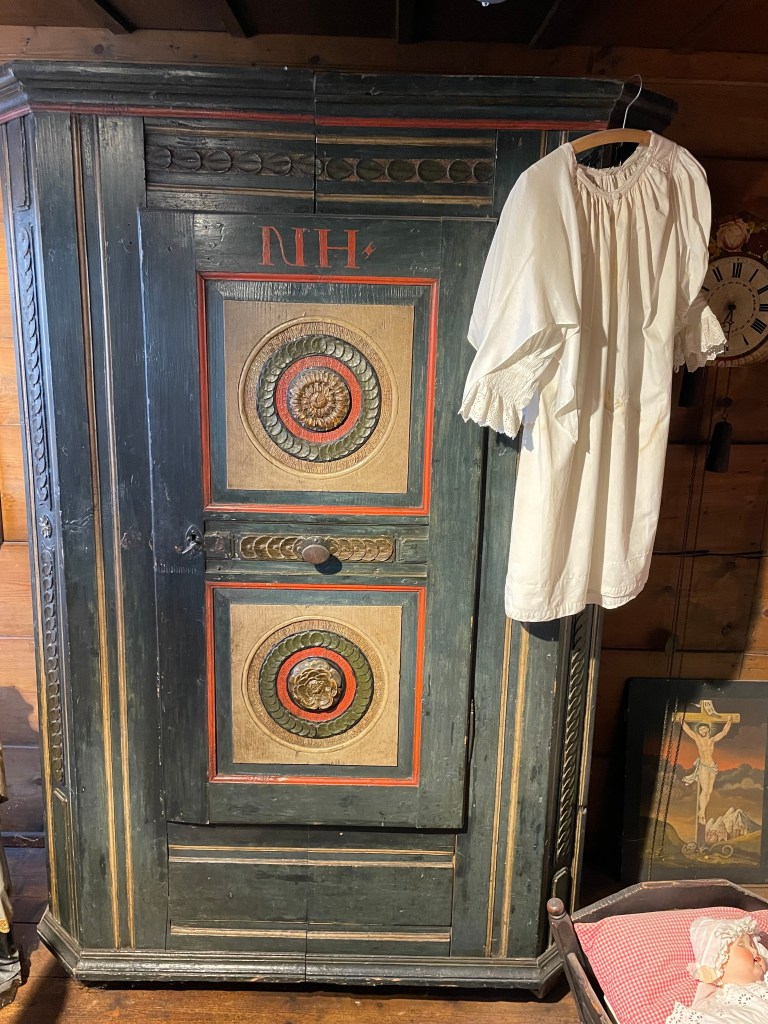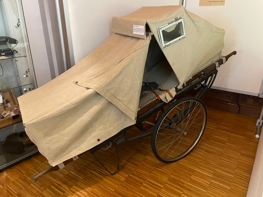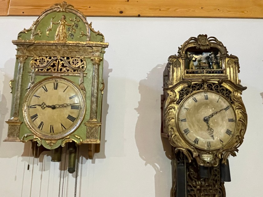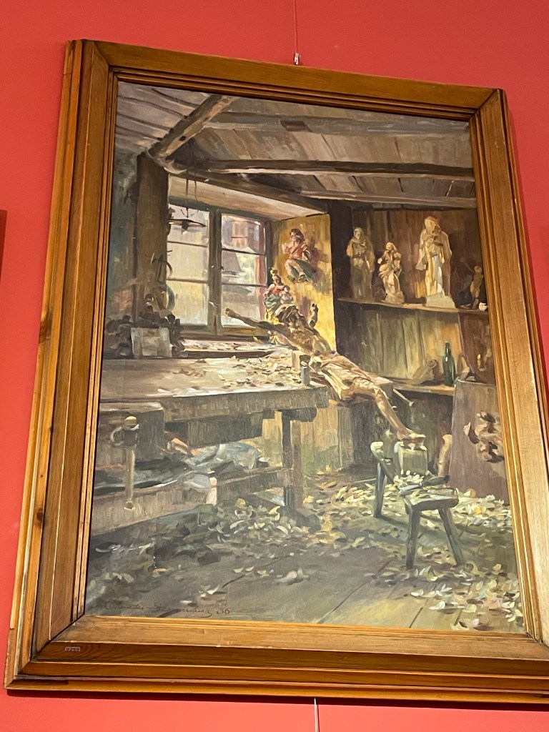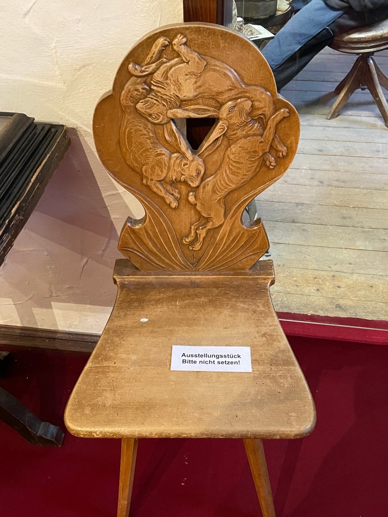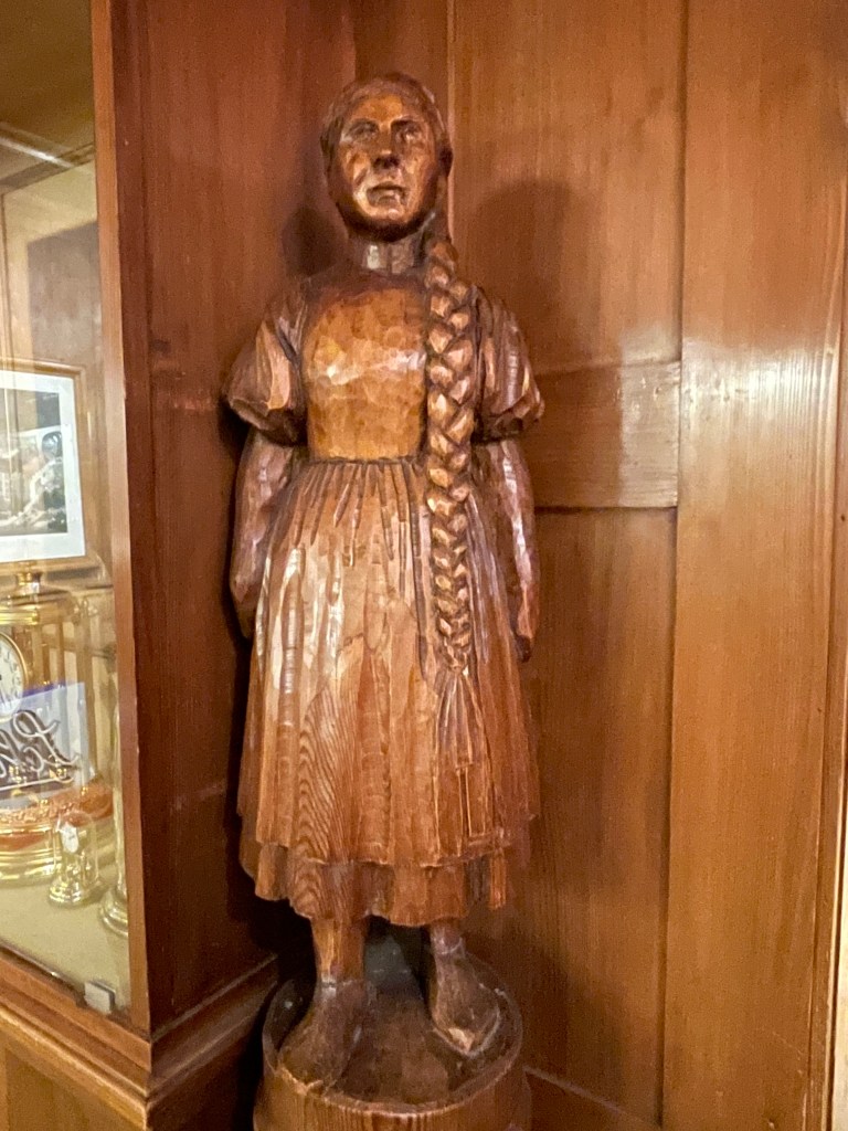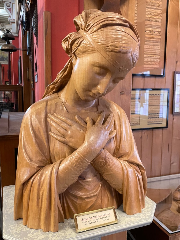We first went to the Schwarzwald Museum by the Tourist Office. We spent about an hour in the museum and it was Wonderful. Lots of good German Black Forest history. We saw traditional clothing, celebration clothing, and house wares. The museum was filled with beautiful wood carvings and carved furniture. Some rooms in the (house) were set up as they would have been–with straw weaving, watch making, wood carving, and a typical bedroom. We loved it all.