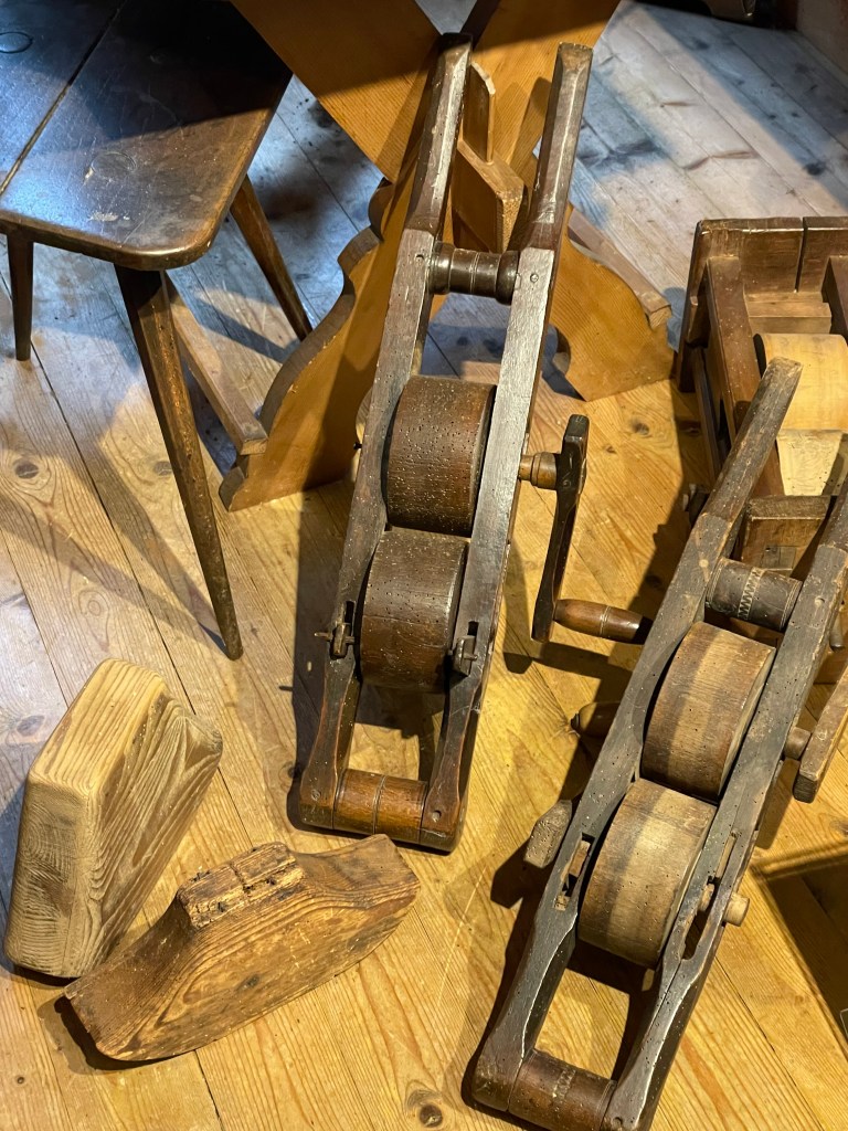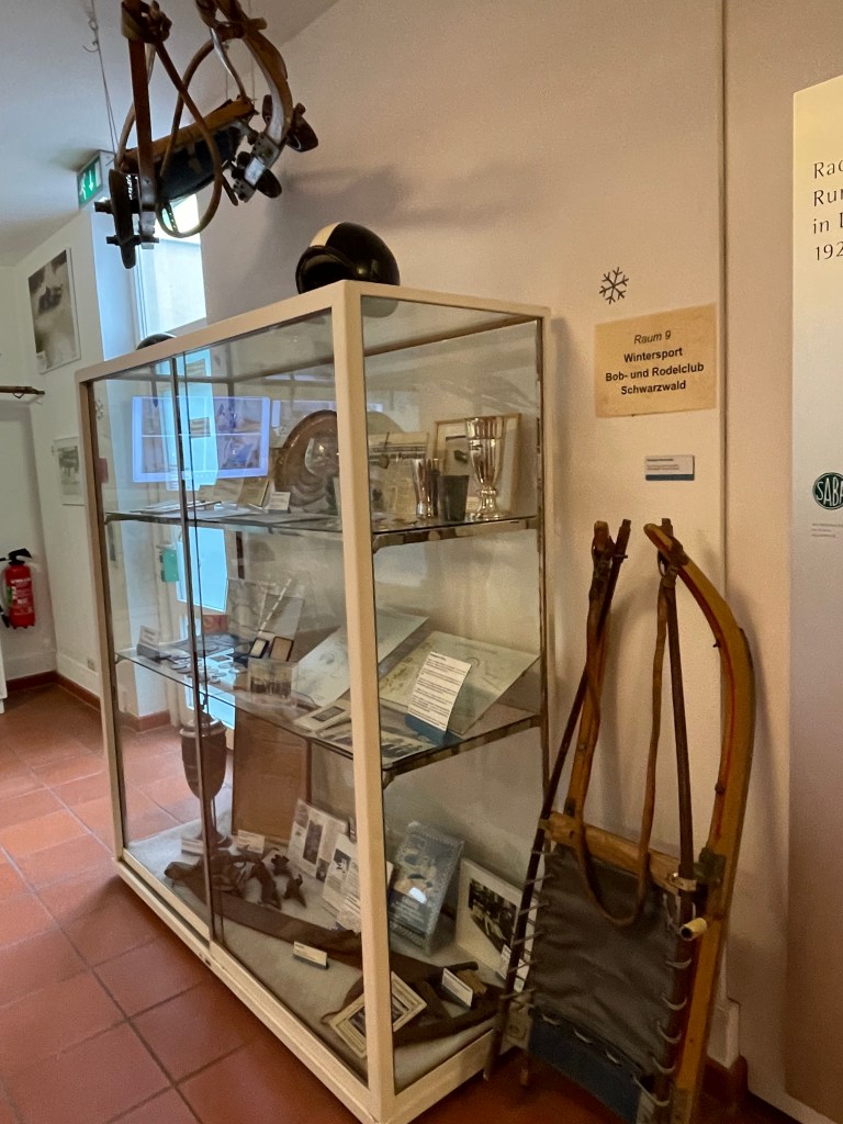 The museum tour ended in a room with sleds, toboggans and ski items.