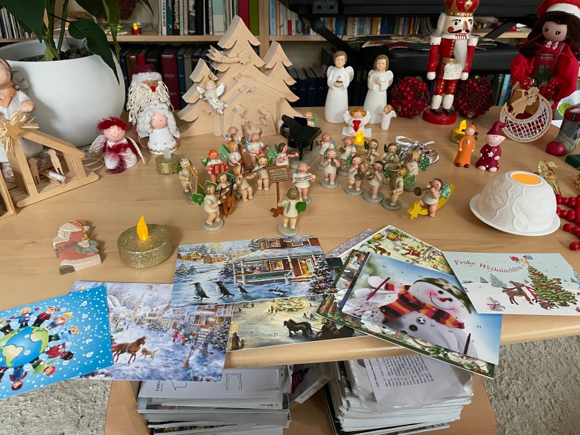 Another popular tradition here is sending an Advent card with tiny windows that open each day. Here are a few cards she showed us, received from friends: