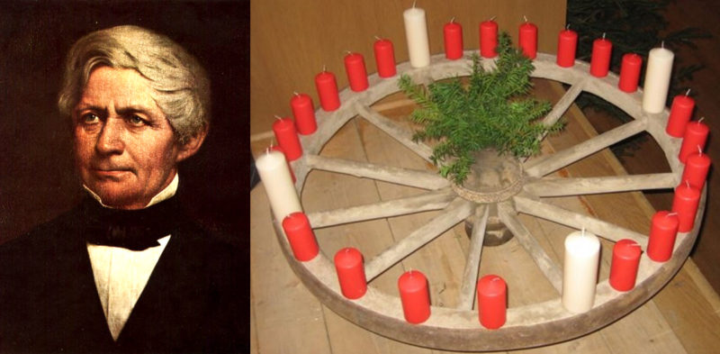 In 1838, he took a cart wheel and put on it 4 large white candles for Advent Sundays and small red candles for weekdays. He hung this wheel in the prayer room of the orphanage so the boys could see in a glance how many days were left before Christmas as they lit one candle each day.