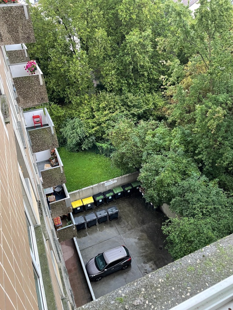 Here’s the view from the window by our front door looking down on the garbage cans: