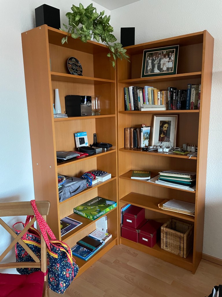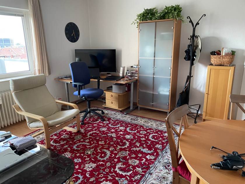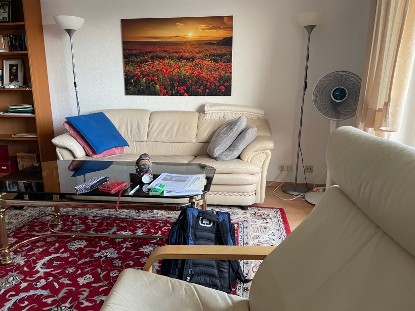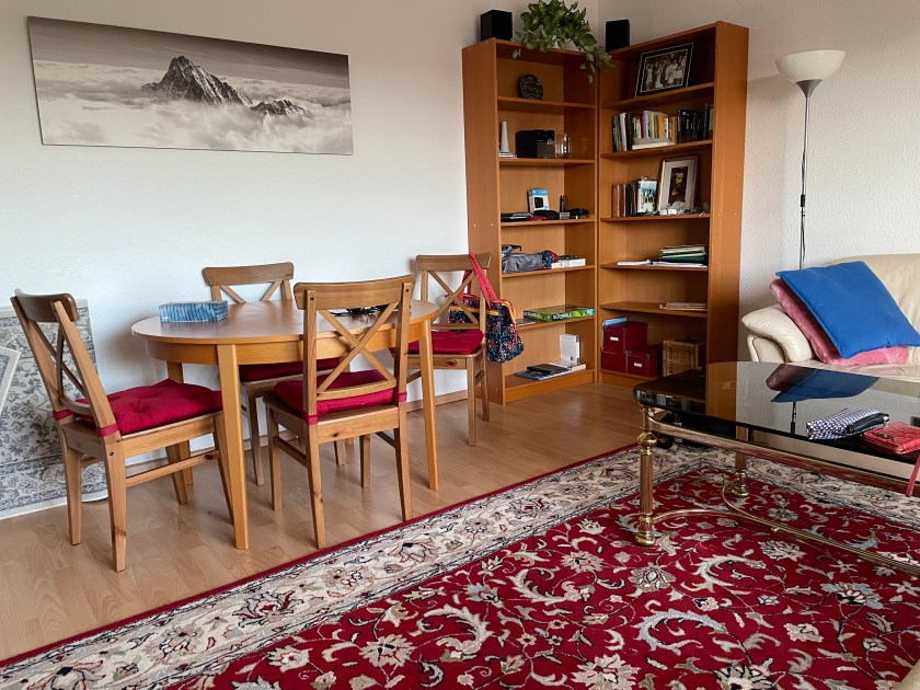 Here is our wonderful apartment! It’s just perfect. We have a sitting room with a small eating table, a desk in one corner and bookshelves in the other.