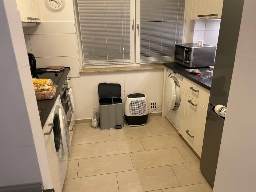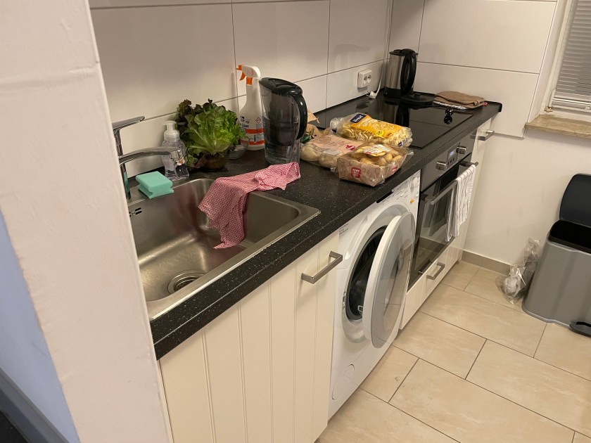 Here is the kitchen. We were lucky to get an apartment with a double wide kitchen, most are half this size. The washer and dryer are here in the kitchen.