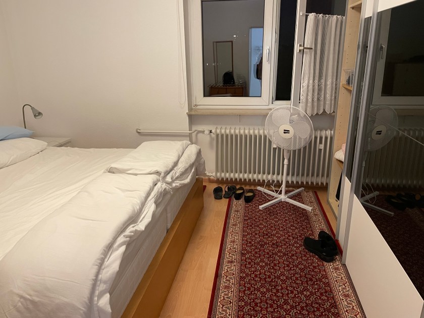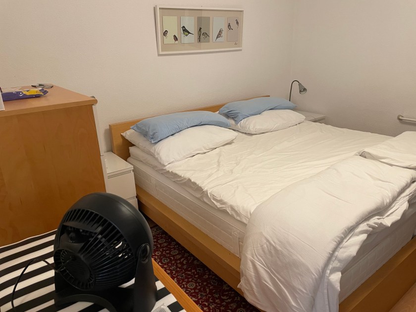 Here’s our bedroom. We keep things cool with fans and open windows. There is no air conditioning.