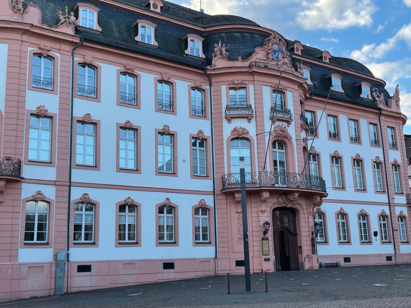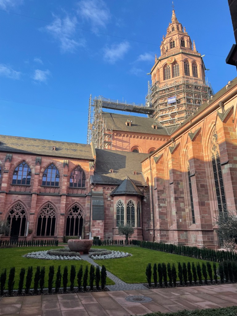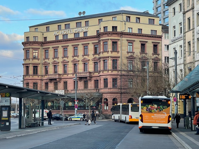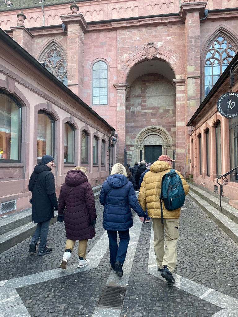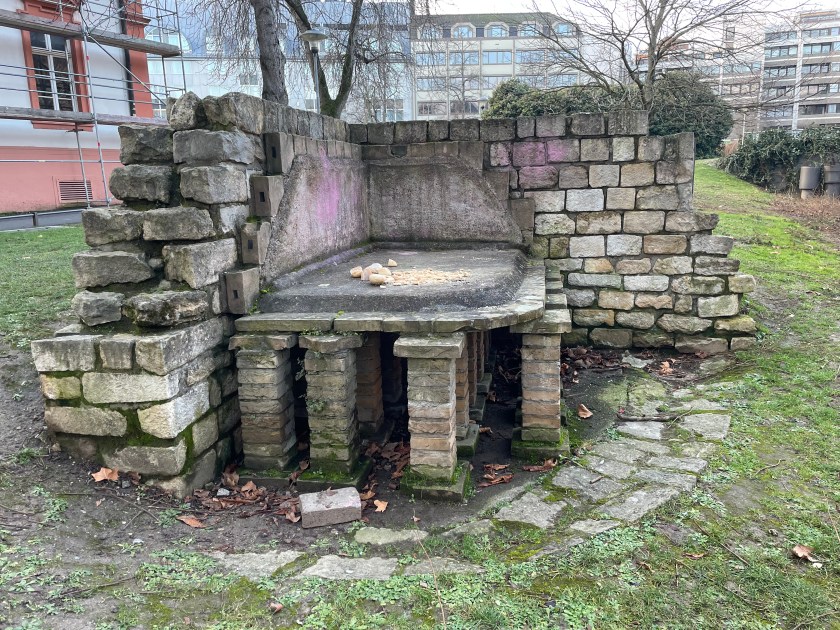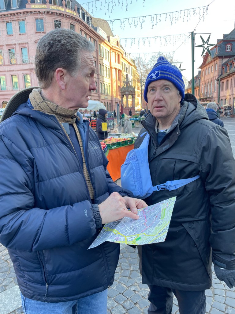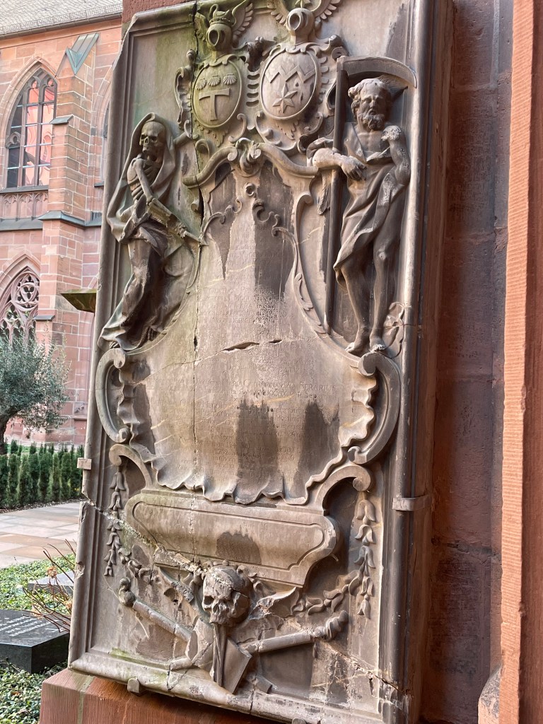 Here’s a marker that says on 27 Feb 1945, 1200 people died here in the heaviest bombing unleashed by Hitler in Mainz. NEVER AGAIN WAR.