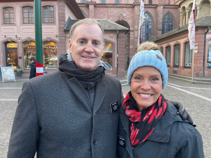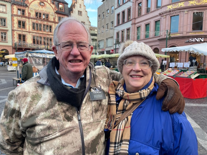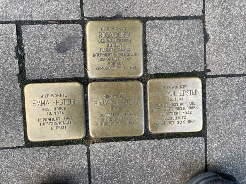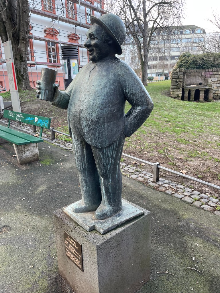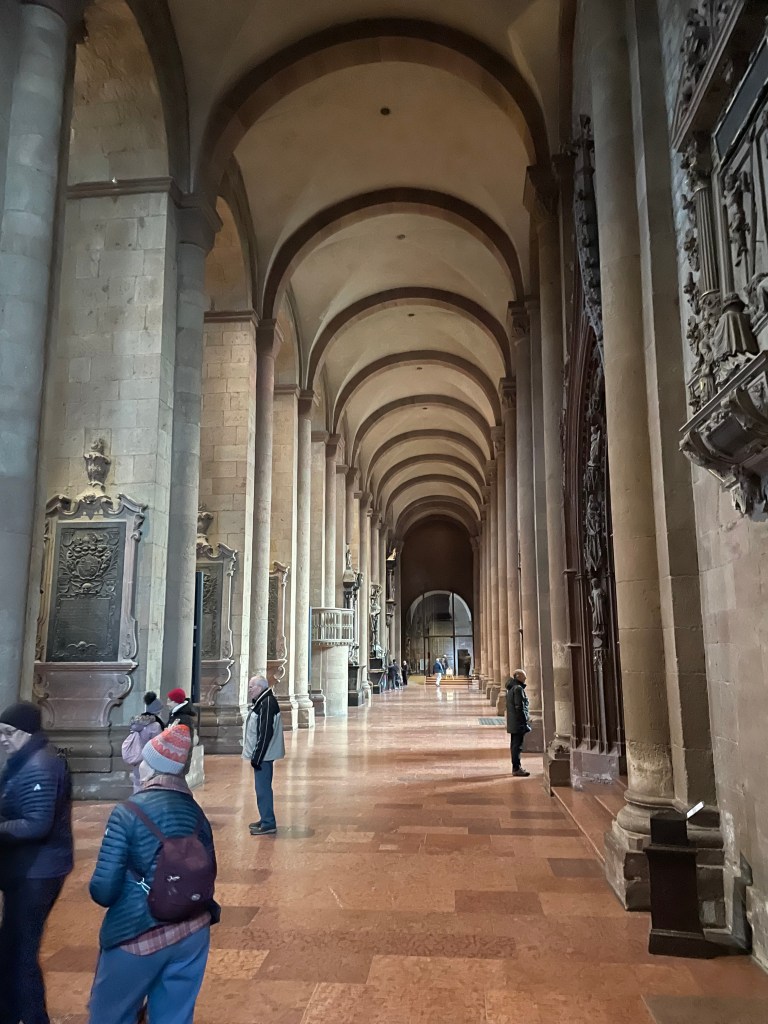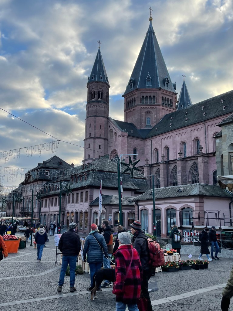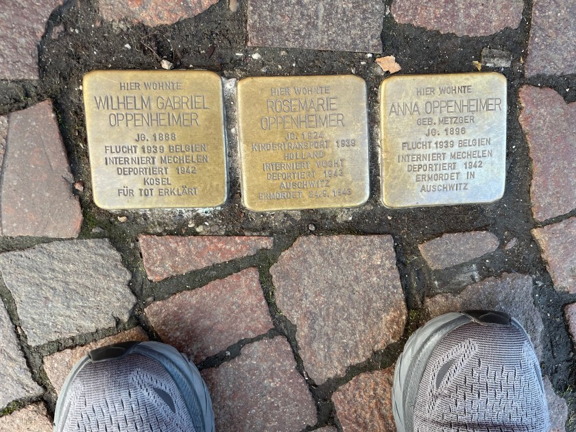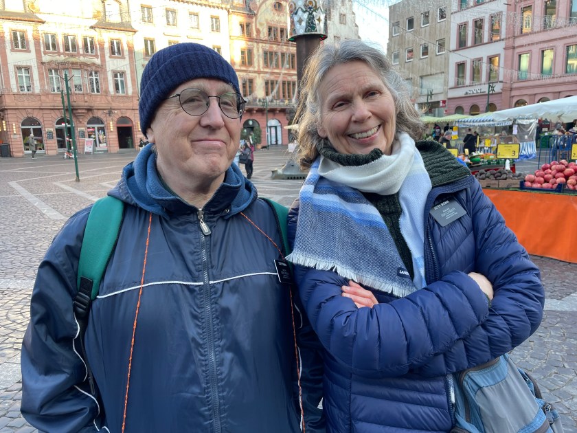 Here’s a marker that says on 27 Feb 1945, 1200 people died here in the heaviest bombing unleashed by Hitler in Mainz. NEVER AGAIN WAR.