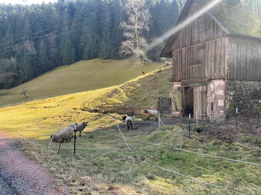 There are small towns and scattered farm homes in these mountains, each with a small or large clearing. At one point we drove by a beautiful field with a furry horse (winter coat) grazing, a bit further on there were some sheep. As we paused to take a photo of them, a car came by and stopped by John’s window. “Schöne Schafe, gel?” said a handsome bearded young man. (Beautiful sheep, right?) We said, “Oh, so schöne!!” He told us they were his and his farm was just up the hillside. “Take all the photos you want” he said as he drove on.