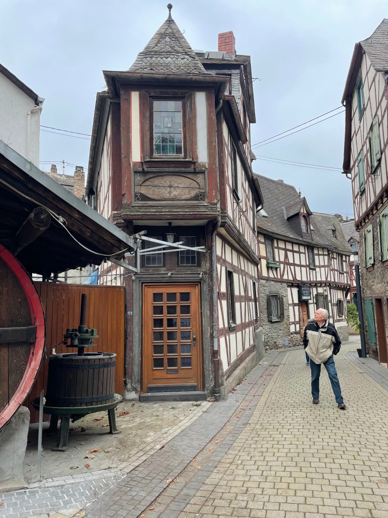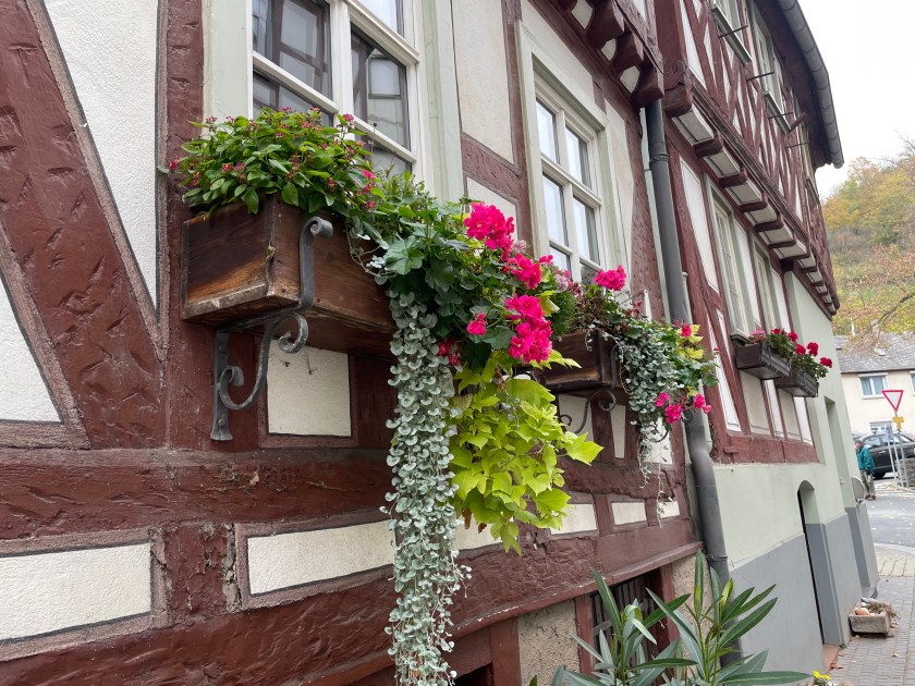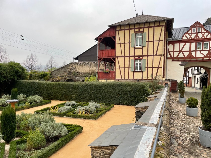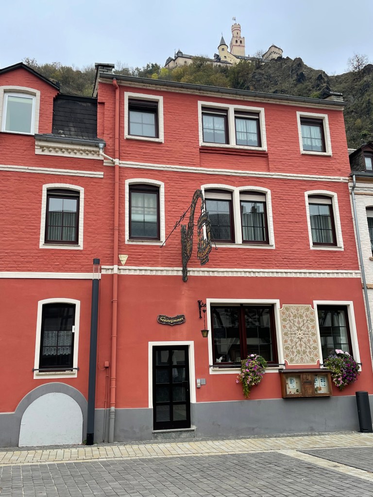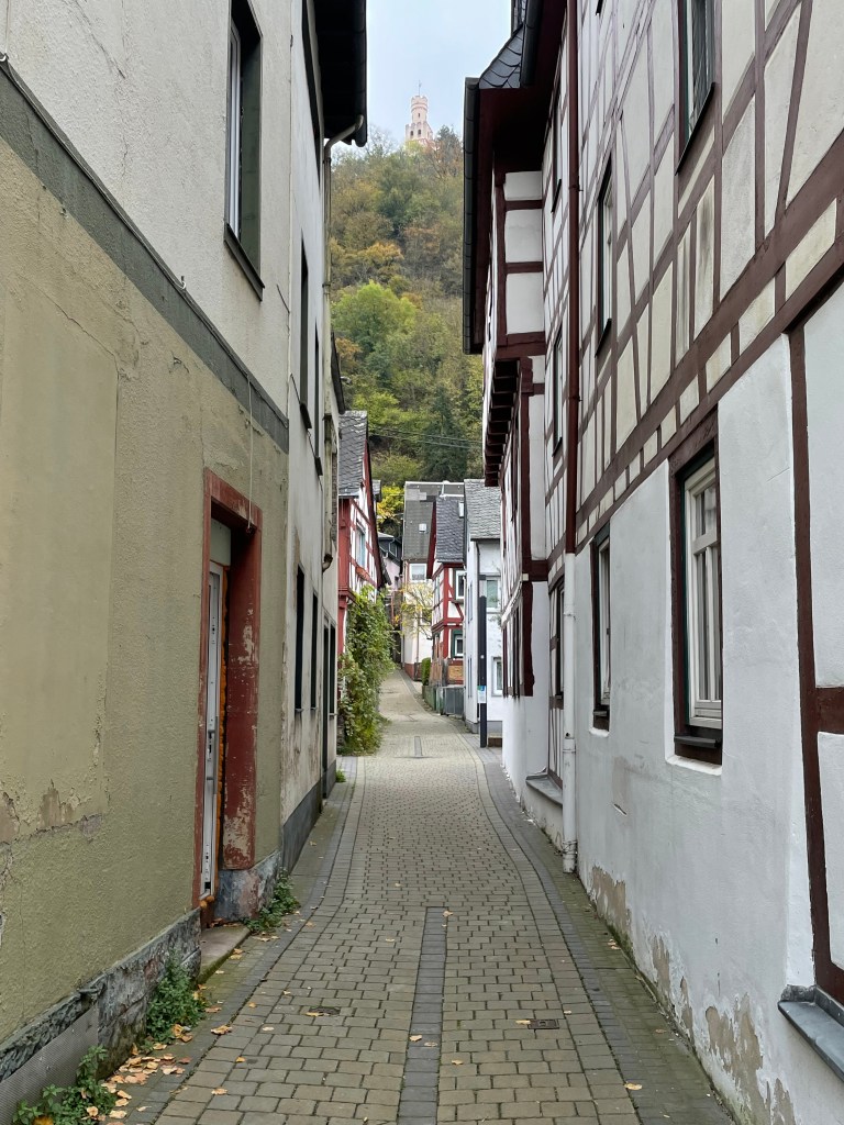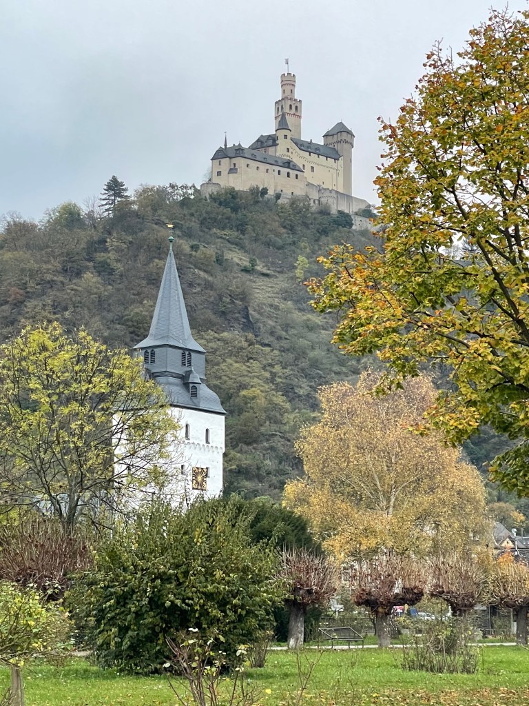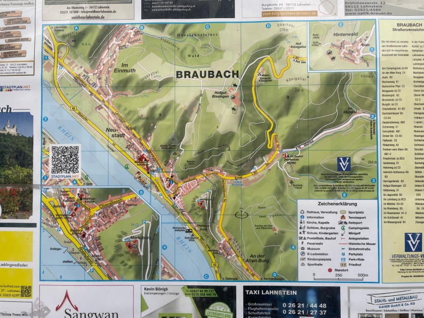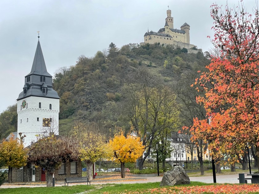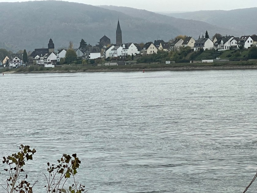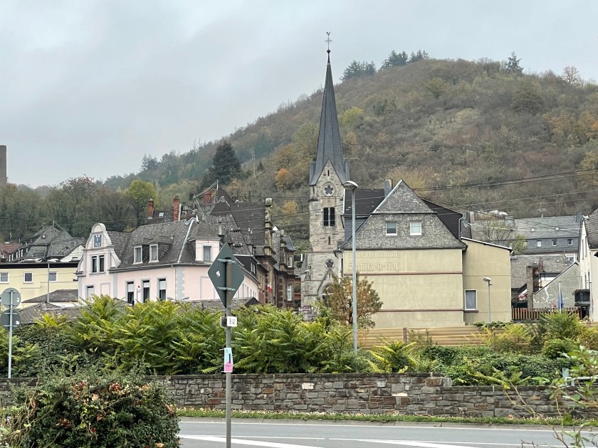 After visiting the Marksburg Castle up on the mountain top, we wanted to wander in the town below, so we went back to our cars and drove into town. The parking was in a strip along the road next to the river. There was a beautiful walking area along the river, like a promenade with trees and some benches. We felt like we were the only ones there.