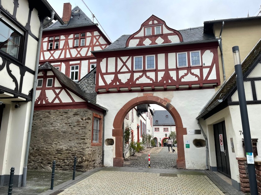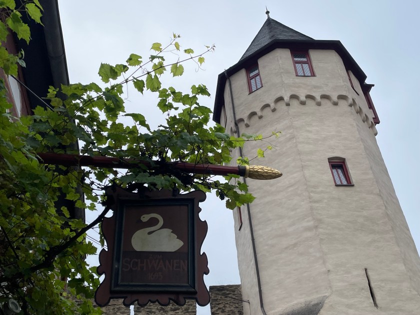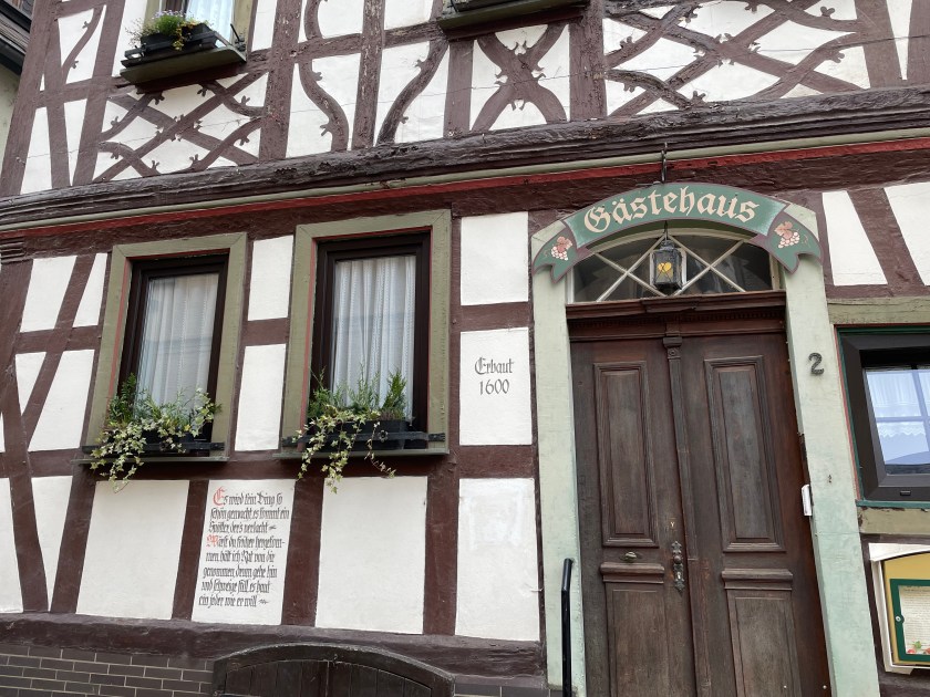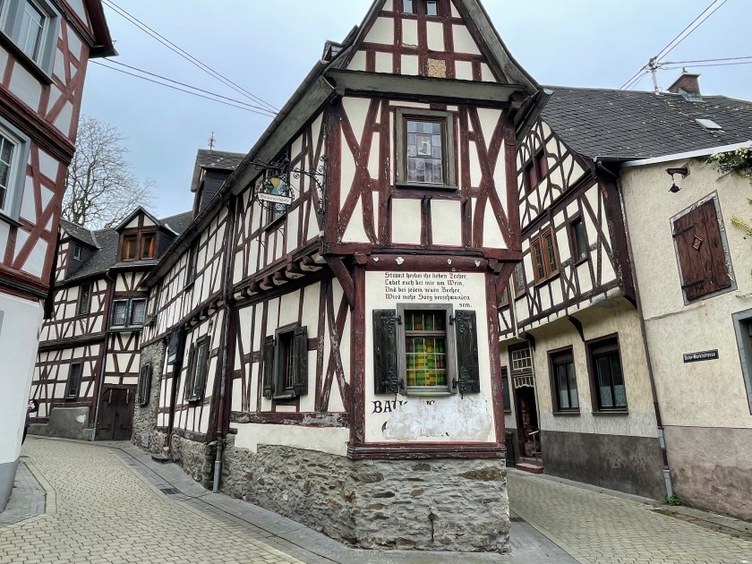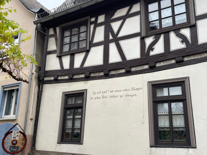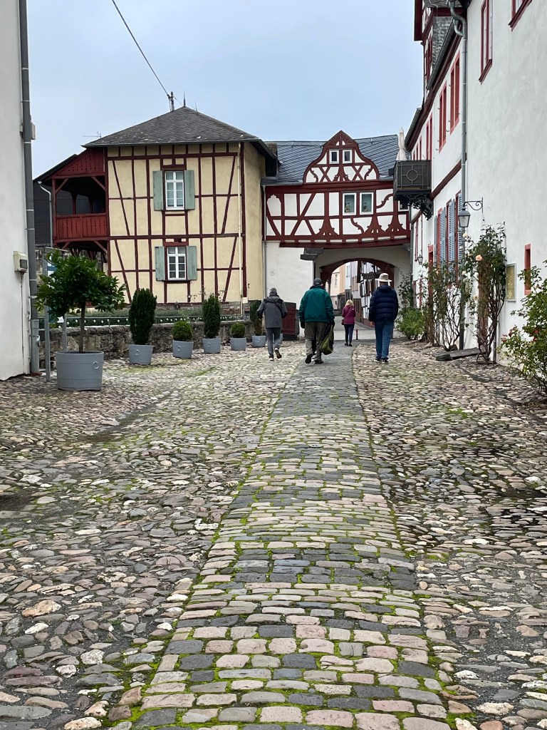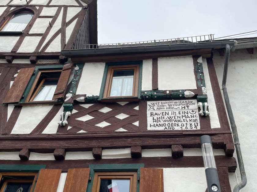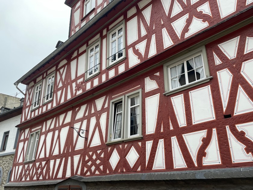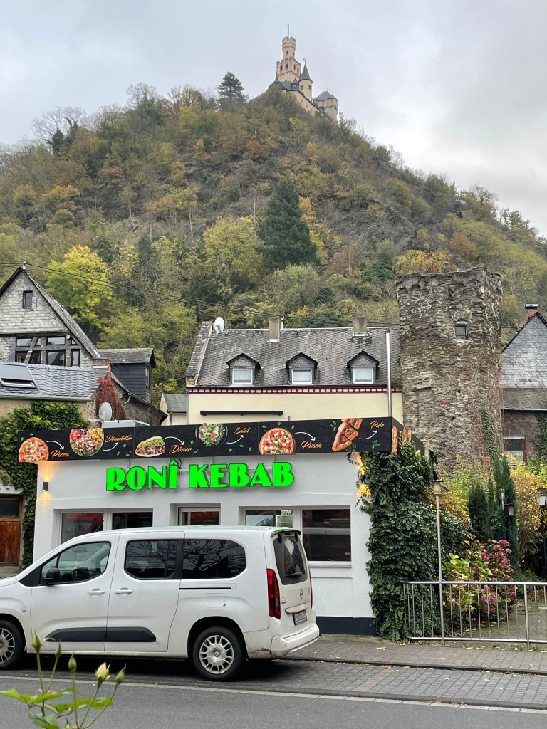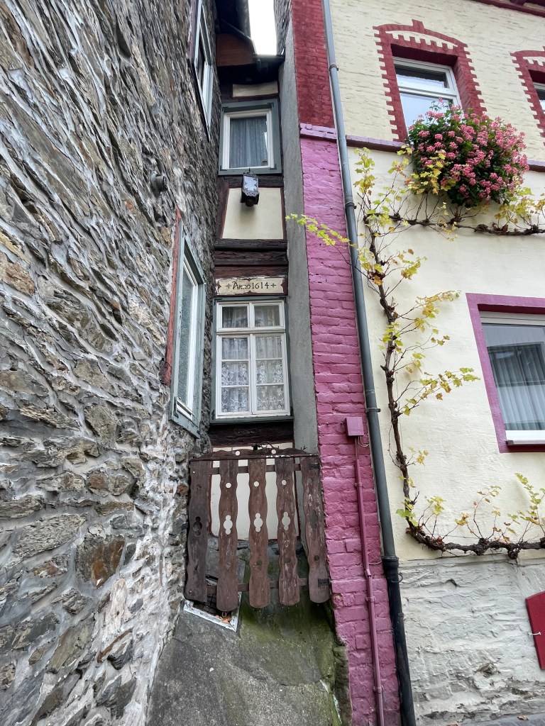 After visiting the Marksburg Castle up on the mountain top, we wanted to wander in the town below, so we went back to our cars and drove into town. The parking was in a strip along the road next to the river. There was a beautiful walking area along the river, like a promenade with trees and some benches. We felt like we were the only ones there.
