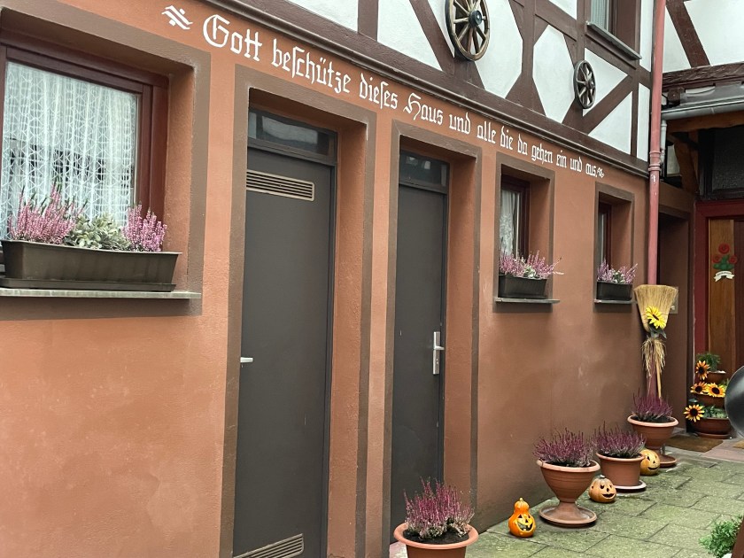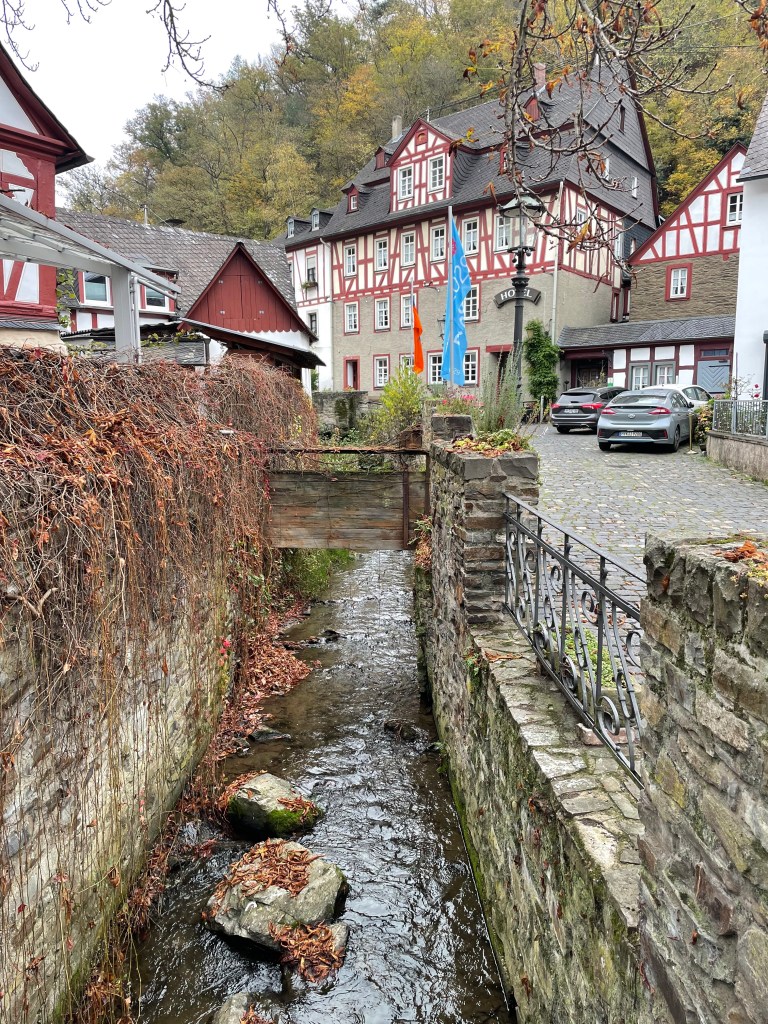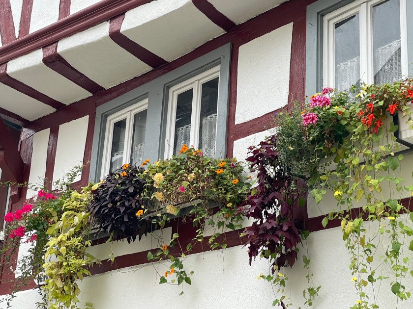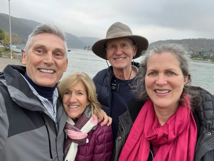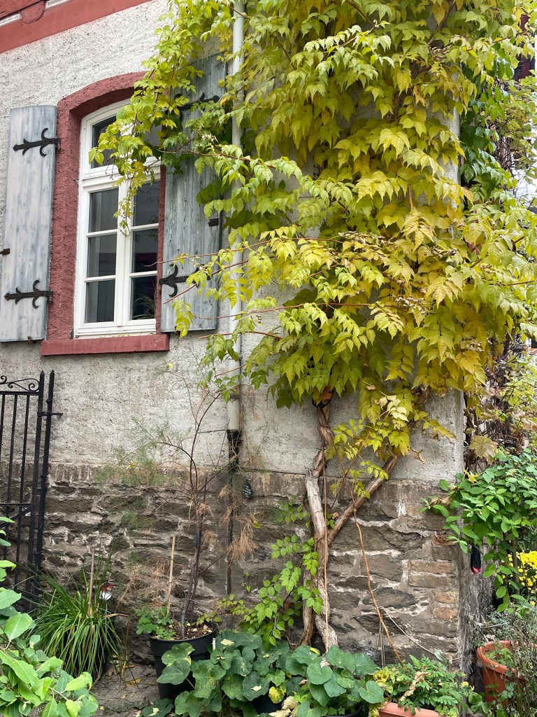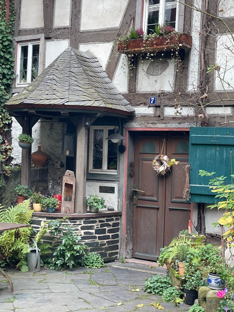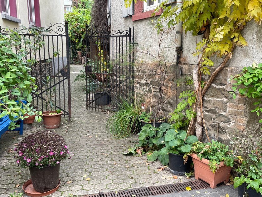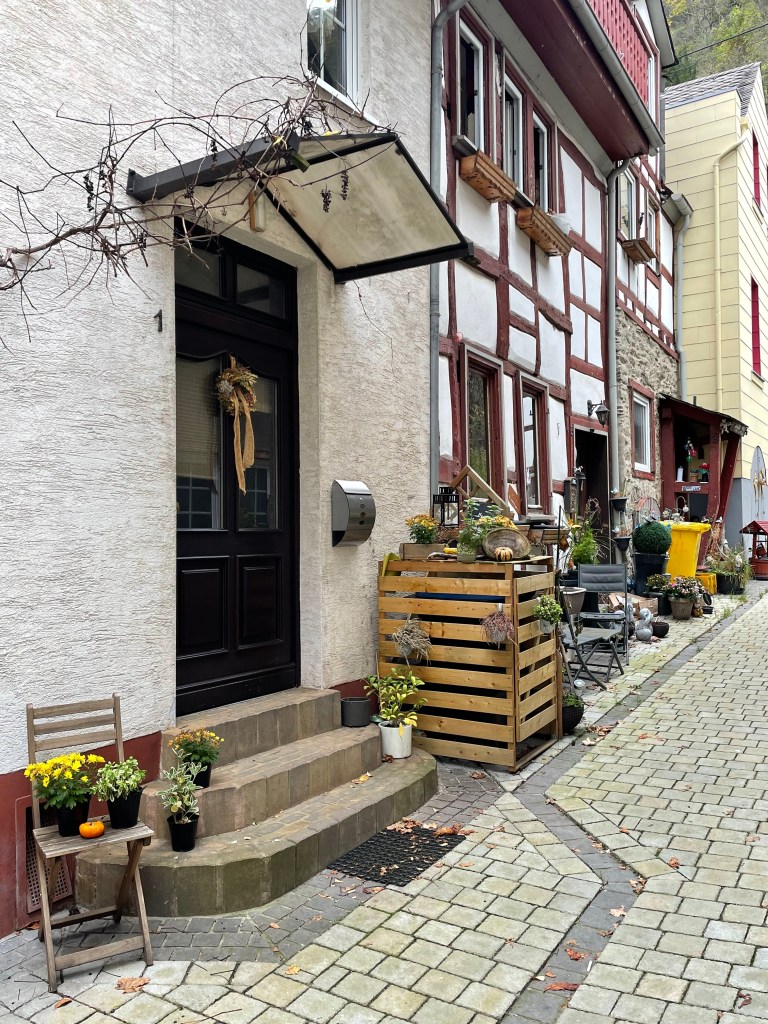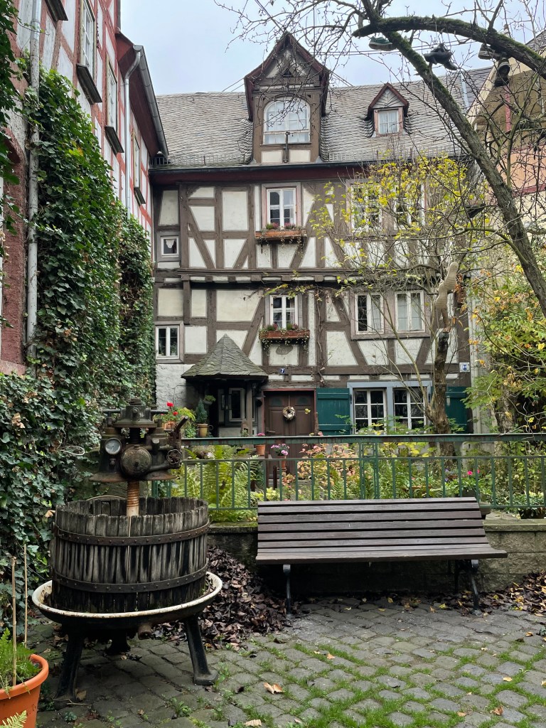 After visiting the Marksburg Castle up on the mountain top, we wanted to wander in the town below, so we went back to our cars and drove into town. The parking was in a strip along the road next to the river. There was a beautiful walking area along the river, like a promenade with trees and some benches. We felt like we were the only ones there.