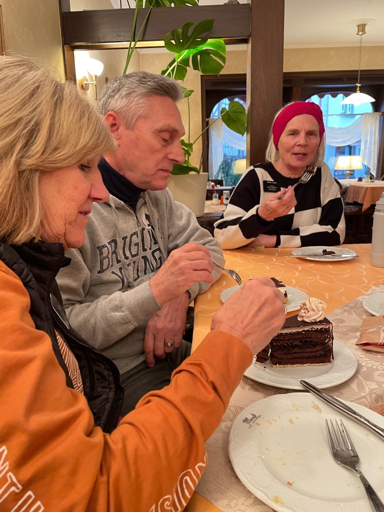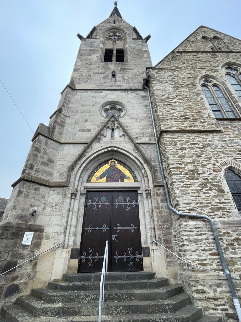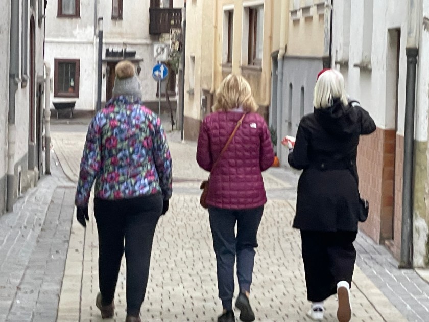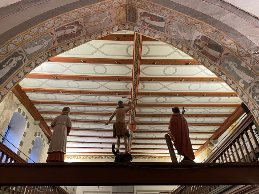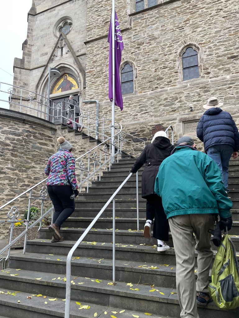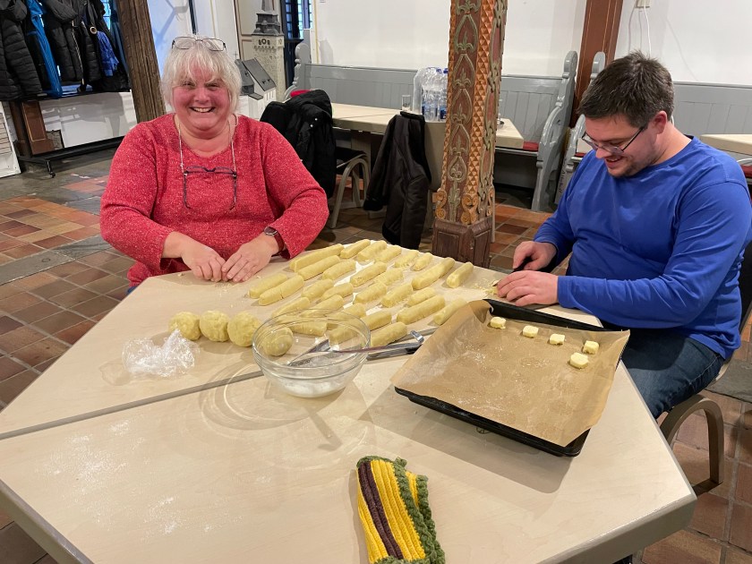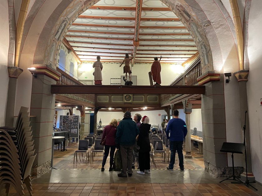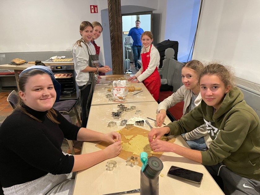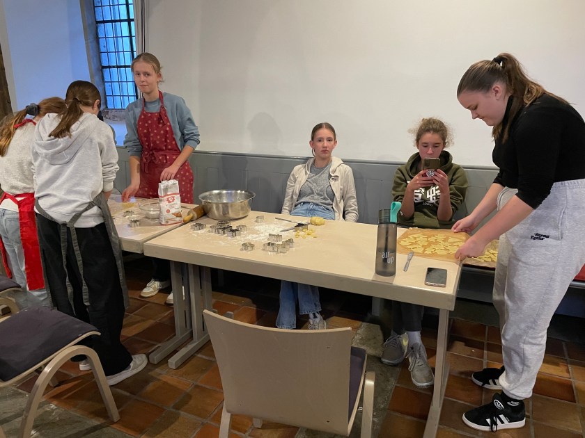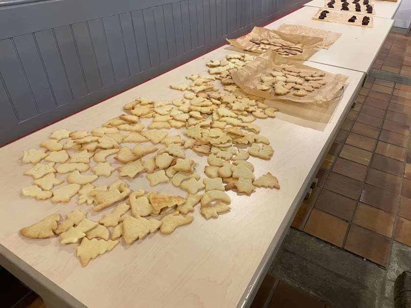 It was also locked, but we heard voices in side and saw a group of people, so we knocked on a window and they invited us right in. It was a group of very friendly Lutherans baking cookies in the chapel (they’d rolled an oven into the room from a back kitchen). It smelled heavenly. The pastor and his wife explained that they were baking cookies to put into tins to take to people in the old folks’ home. There was a class of girls there, about 13 or 14 years old (they will have their confirmations in May). They were helping to cut out cookies with cookie cutters. They were so kind and friendly. It was nice to visit with them. They spoke very little English.