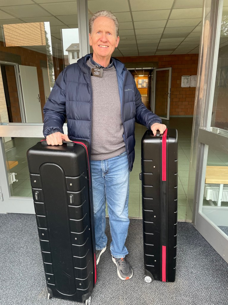 It’s an old town, with lots of murals on the buildings and lots of charm, right on the river. Today was a misty rain day with hardly anyone out and about. Not many shops were open. We found an excellent bakery with fresh plum Kuchen and a raisin bun, and we wandered here for about an hour.
