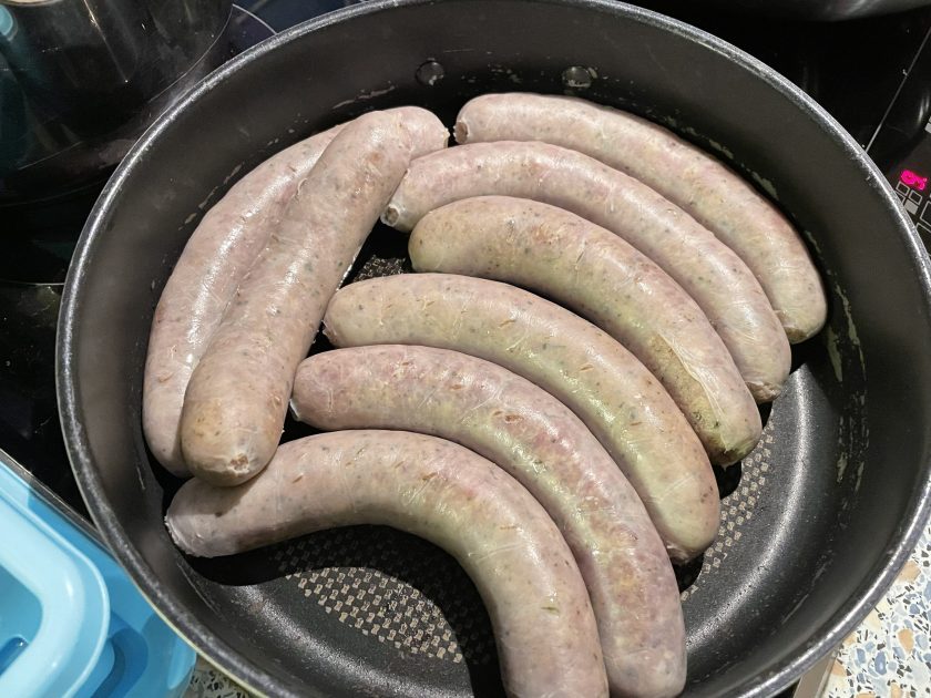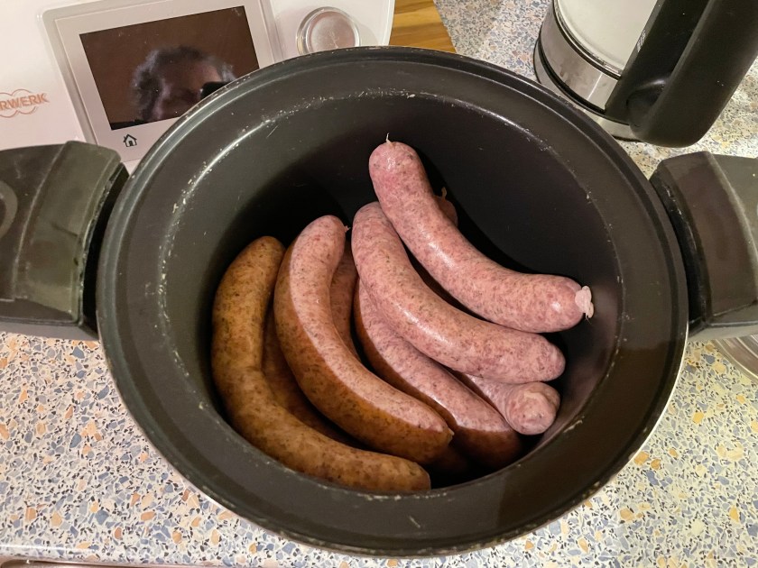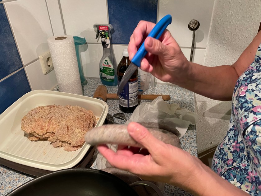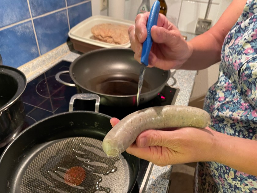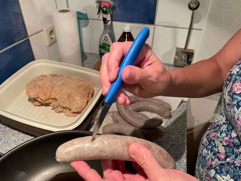 Most butchers have their own recipe for Brats.  The ones we had this evening were probably the most delicious I’ve had so far in Germany.  This evening Jutta showed me how she prepares them as we were preparing our dinner.