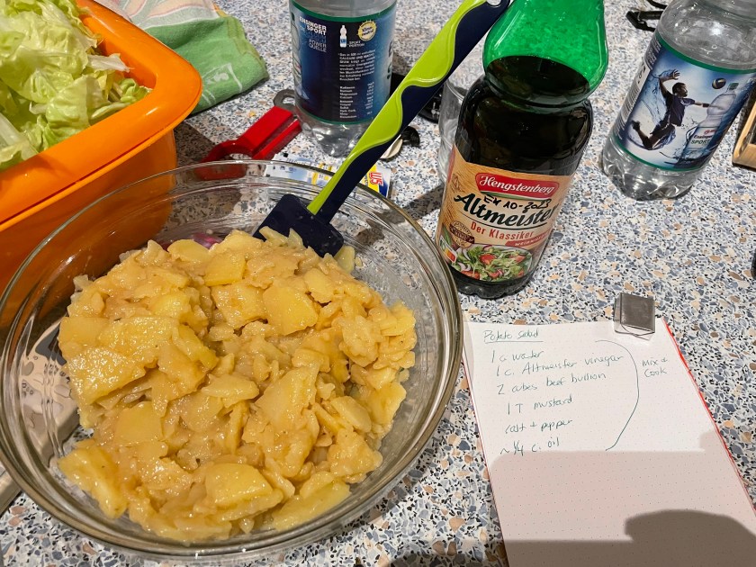 Here’s the recipe I jotted down for Jutta’s potato salad.  Interestingly, she got this recipe from the sister of Regina ,the Archivist, so I will remember her too, when I make this, which I will do!