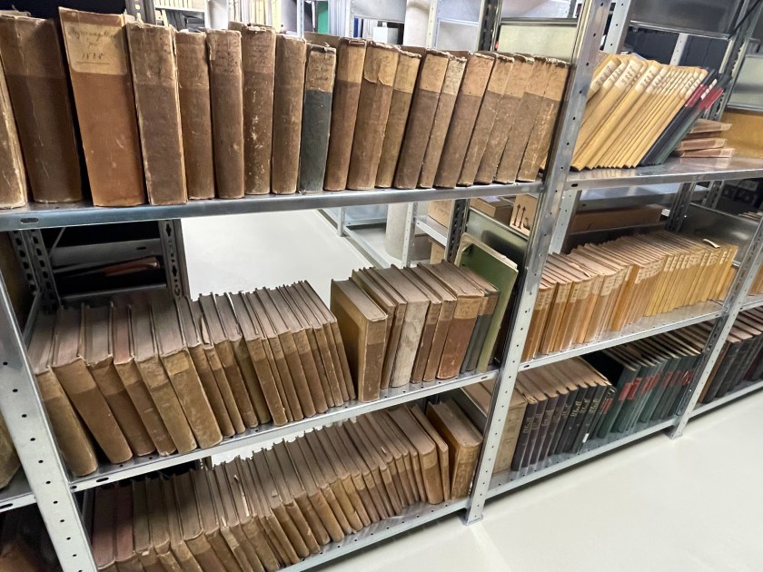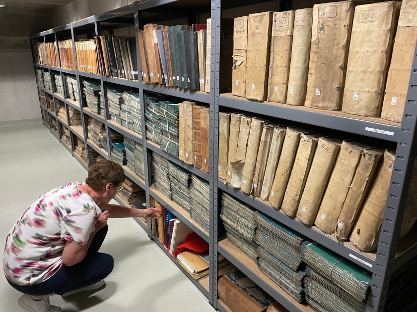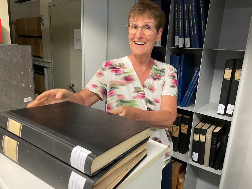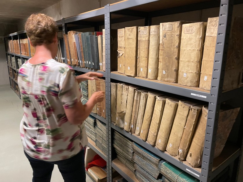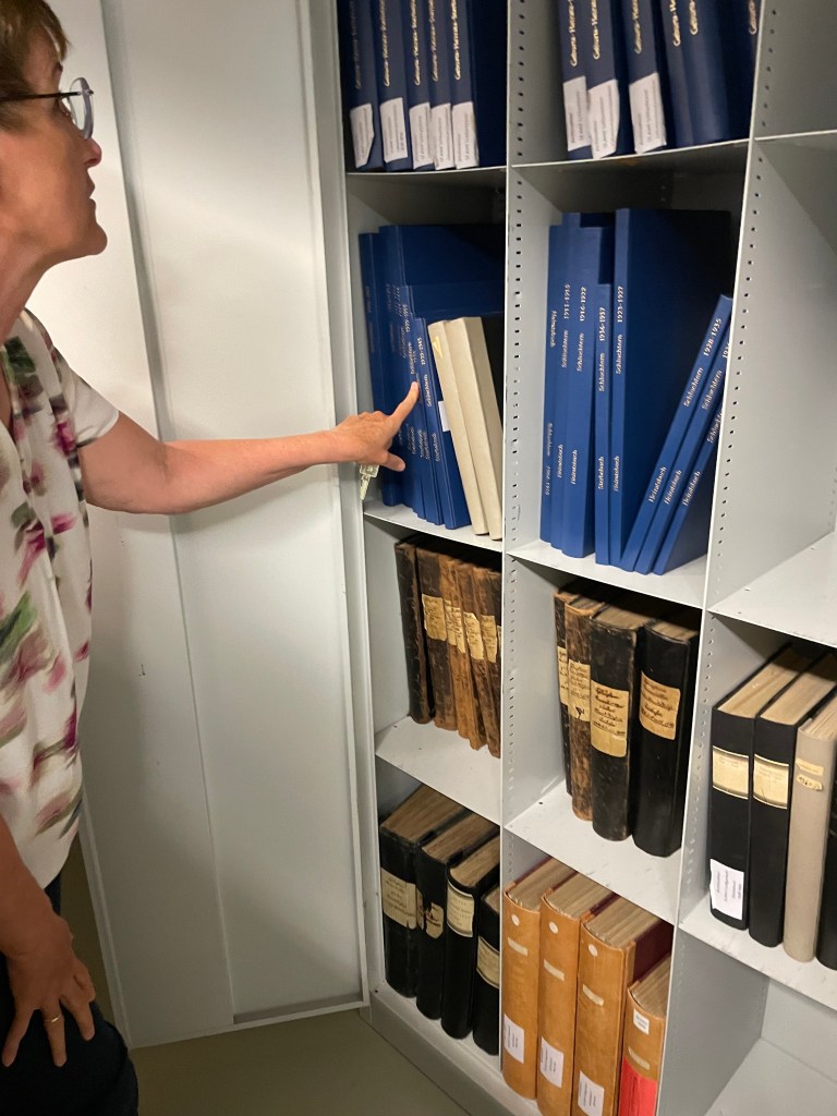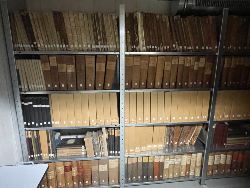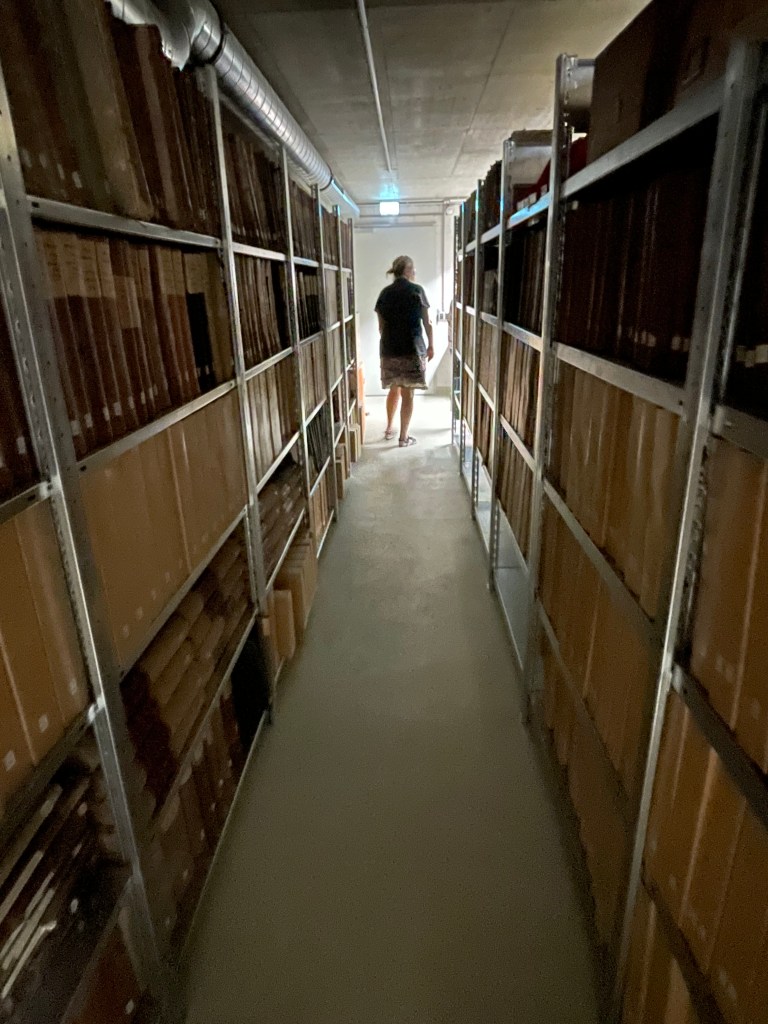 The next morning we were back at it.  I asked Regina if I could go down into the archives with her to see where the record books were kept.  (As we’d finish a book, she’d bring us the next.)