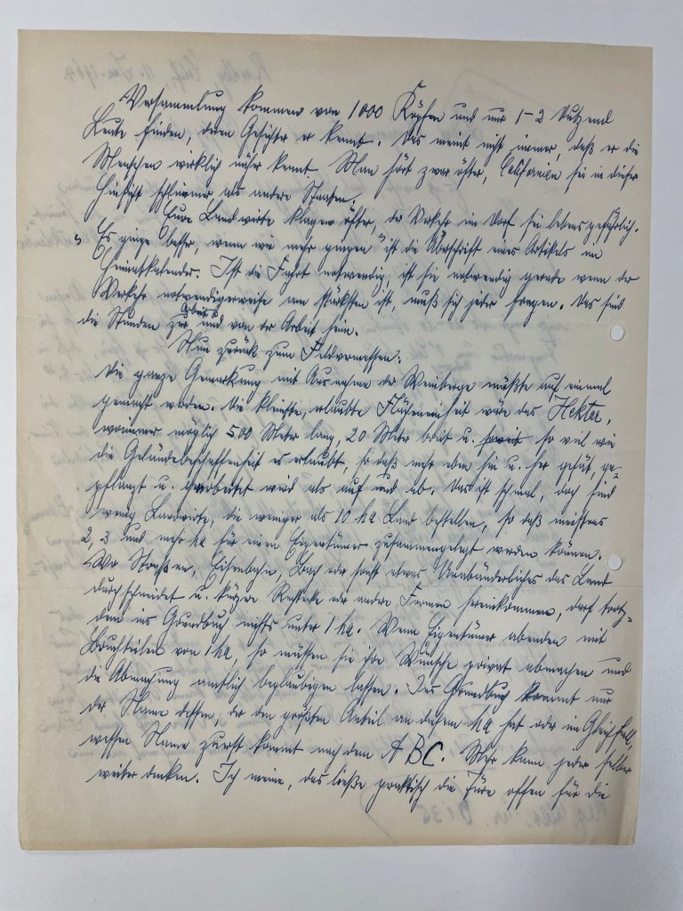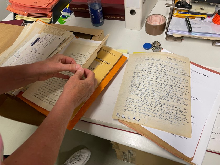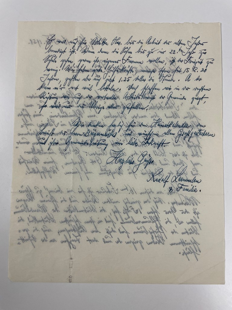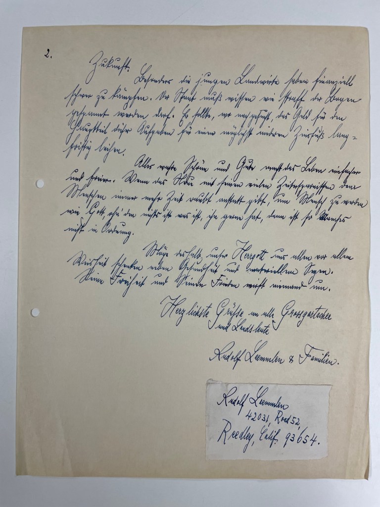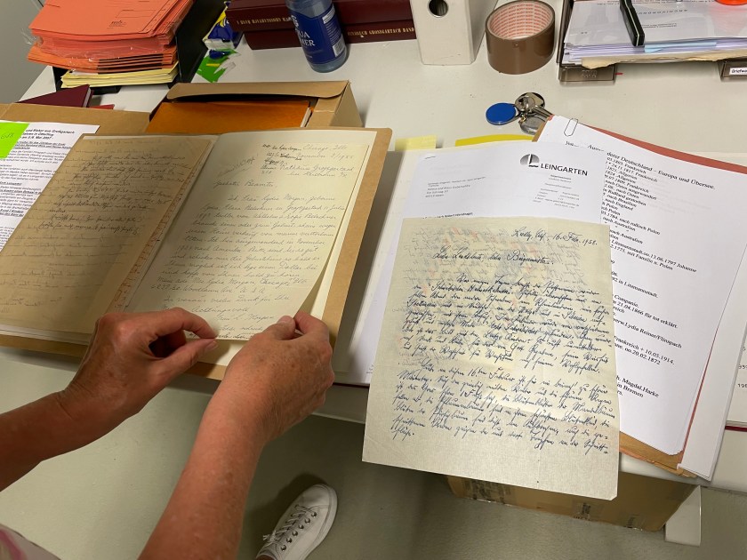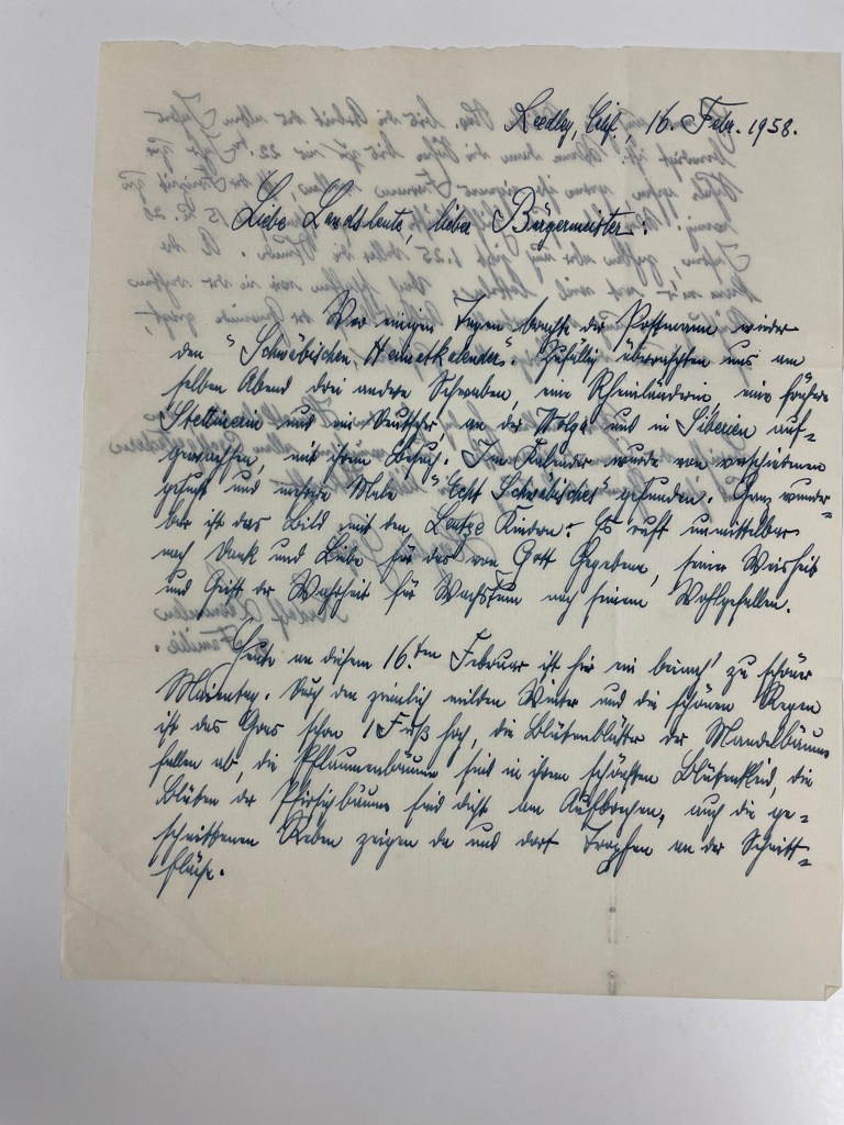 Then she pulled out another folder containing letters that were written by these people, back to the Burgermeister in Grossgartach, reporting on their lives in new places.  As she gently turned the pages of letters, she came to two with handwriting that was very familiar to me!  Rudolf wrote 2 letters back to Grossgartach–one in 1958 and one in 1964.