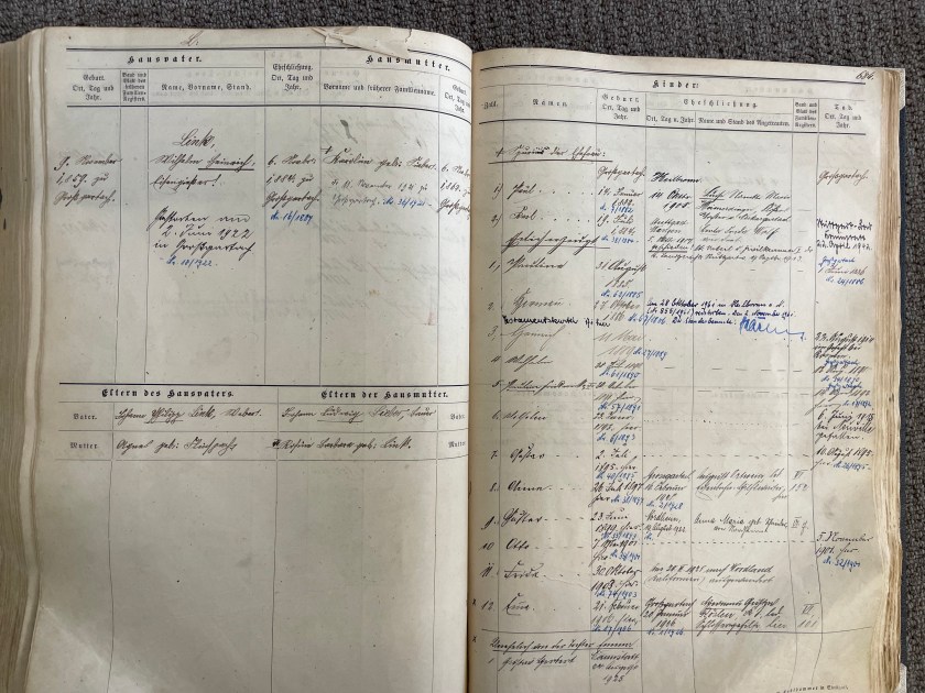 There are 4 different types of records we filmed:  Family Register Books that contain a 2-page entry for every family compiled from birth, marriage and death records.  These are great for putting family relationships together.  They also contain the parents of the father and mother.  Here’s an example of one random page.  Wilhelm Heinrich Link, shown here, is my 4th cousin, 3 times removed.