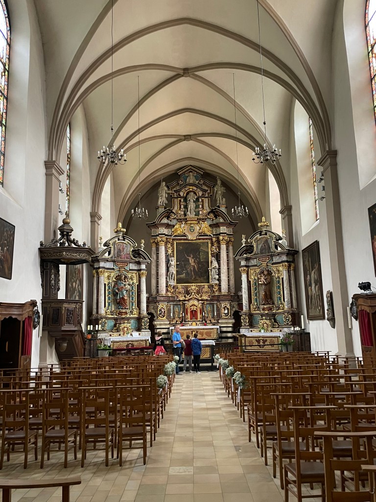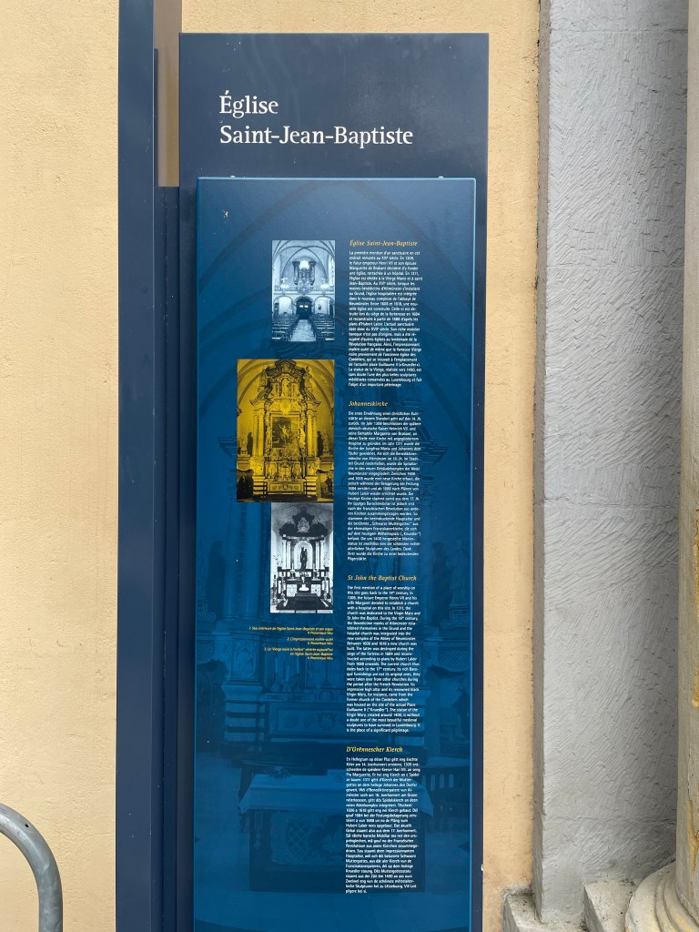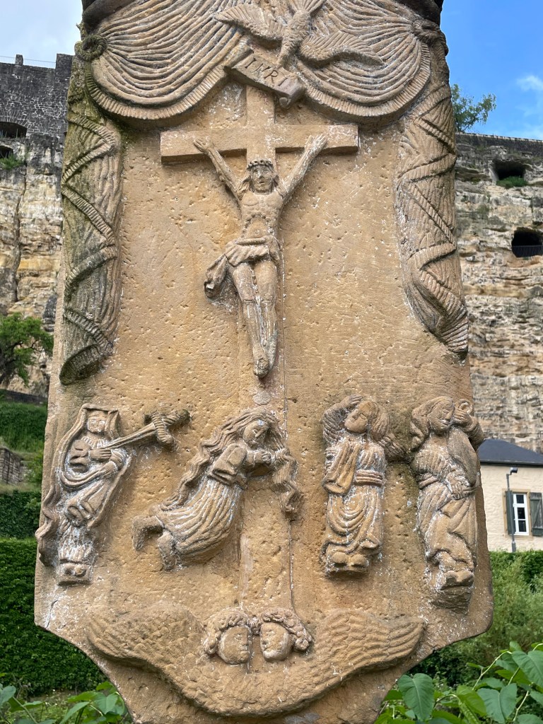 As most Black Madonnas so this one too is deemed to be a miracle working ‘image of grace’. Most people agree that she must have been sculpted around 1360 by a member of the Cologne school of sculpting. However, there are no documents proving this and so some medieval chronicle claims that she was brought to Luxembourg from the Middle East during the crusades, which supposedly is why she was also known as the Egyptian Mother of God. Her titles have changed several times in the course of the centuries. First she was simply called Mother of God and Star of the Heavens. After the 30 Years War she was invoked as the Queen of Peace. After patina and candle soot had further blackened the already dark wood and the plague had struck, she was worshiped as the Black Emergency-Mother-of-God (schwarze Notmuttergottes) charged with protecting her children from the Black Death. Since the faithful appreciate her darkness her skin was painted black in later renovations.