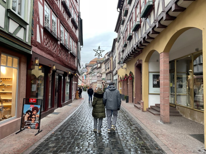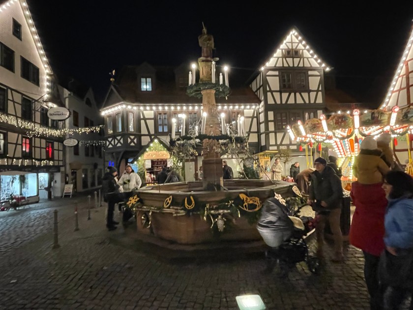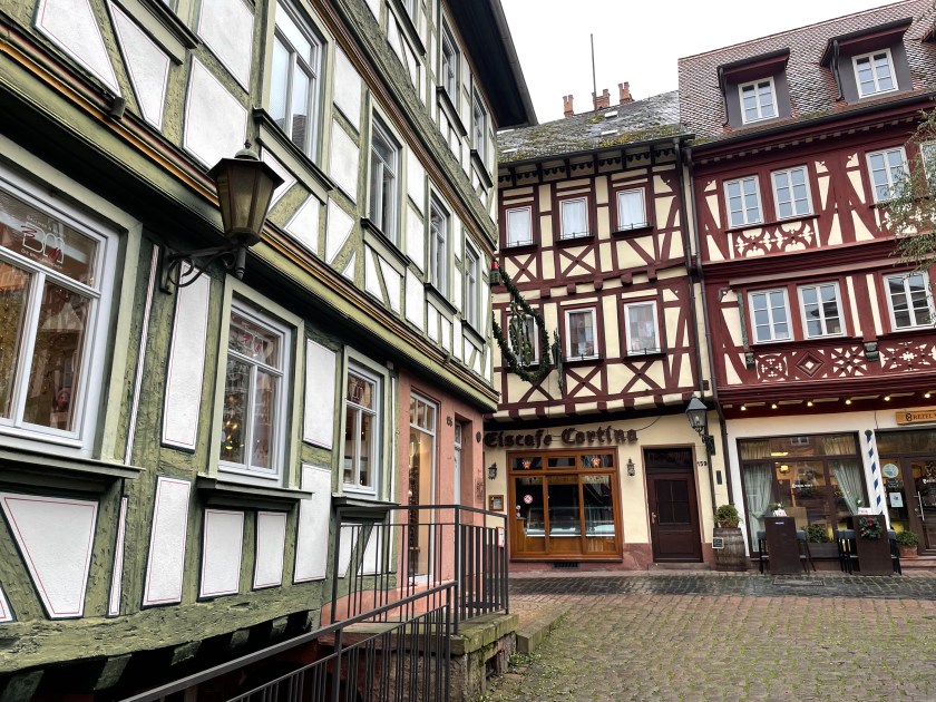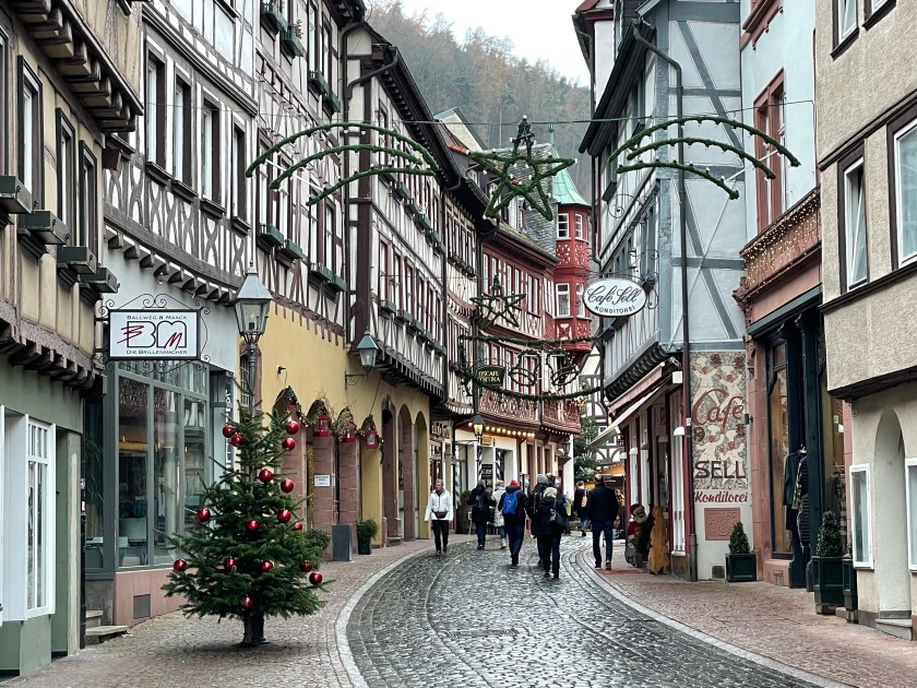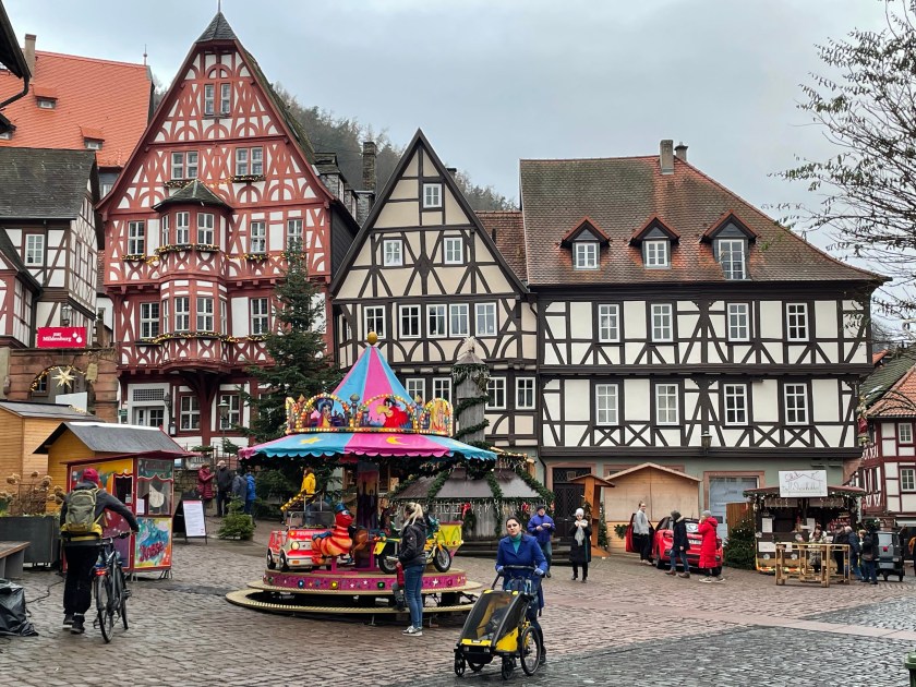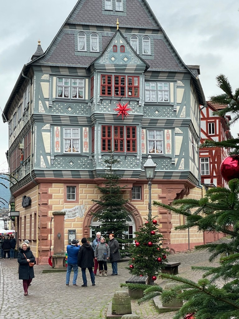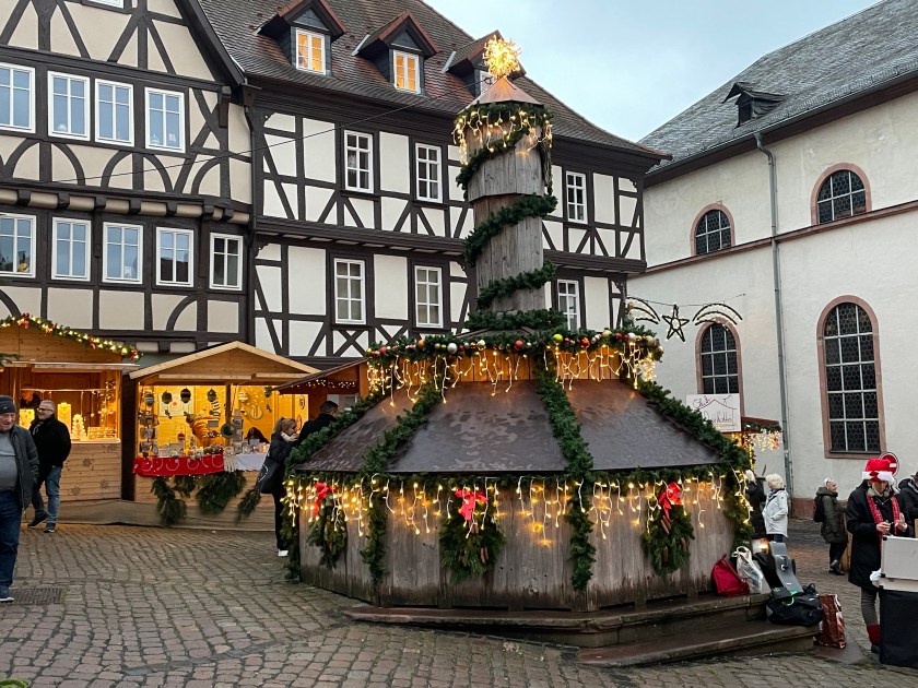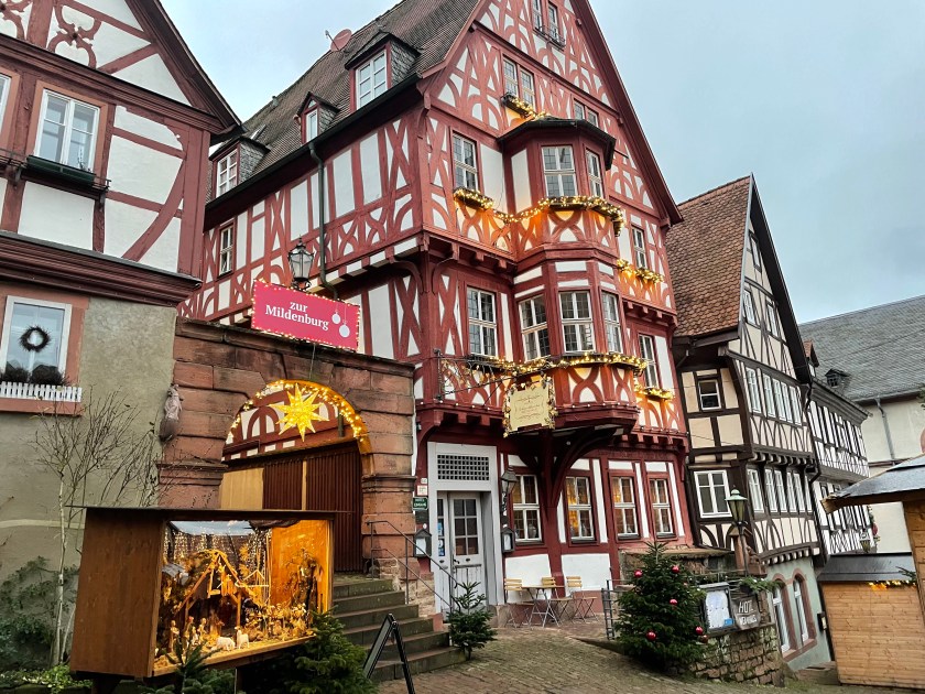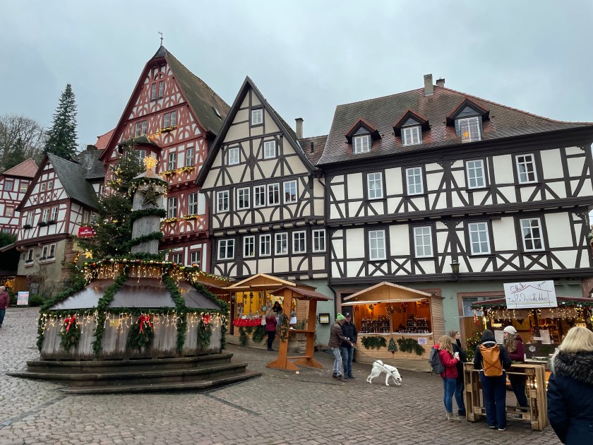 We took the afternoon off to go see two more Christmas markets–Miltenberg and Michelstadt, both about and hour or so from Frankfurt. Miltenberg, our first stop was absolutely delightful. We arrived at about 2:00 and wandered through the town along the main street. There were Christmas market stalls set up along this main street and a few in the small central plaza. It wasn’t what you’d call a large market, but the town was so festive and beautiful, we were really glad to be there during this Christmas season.