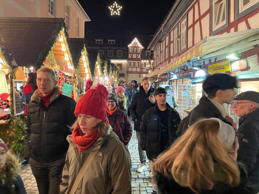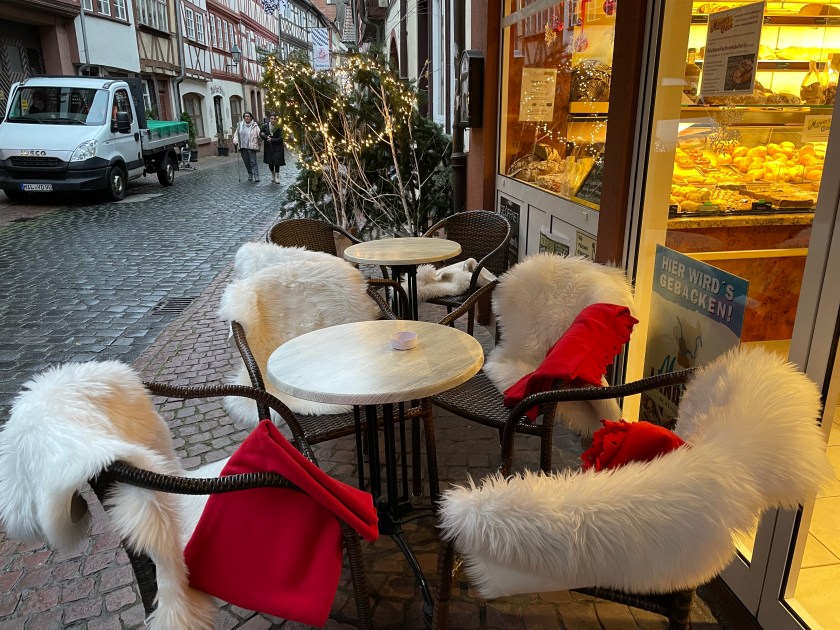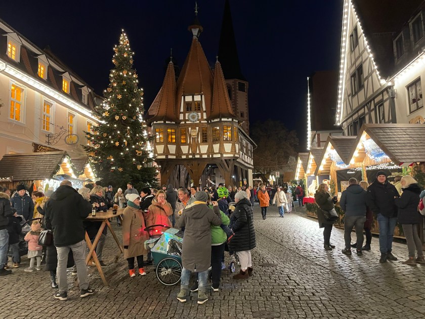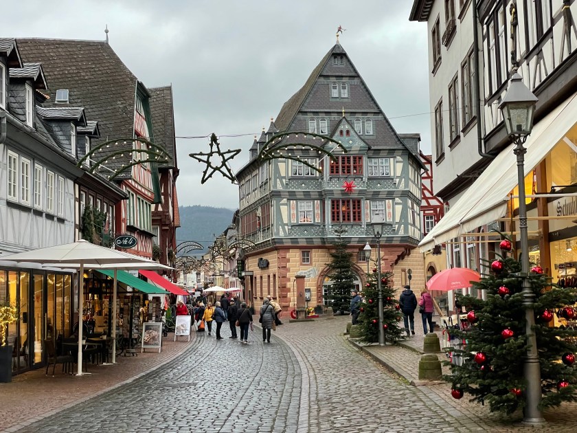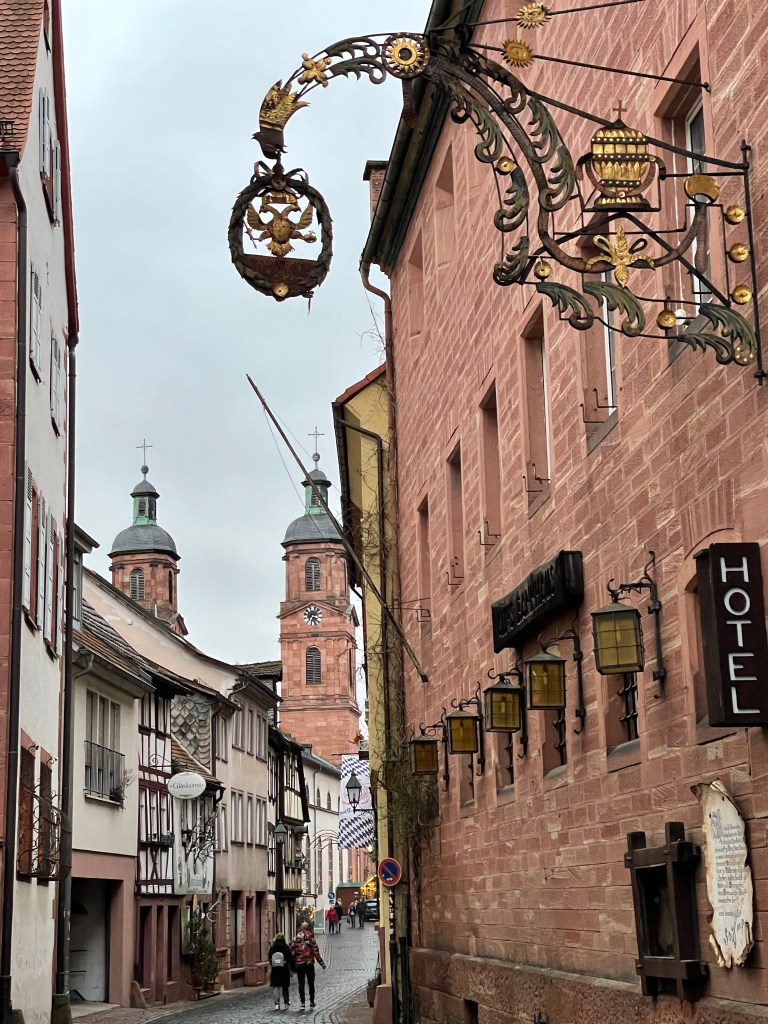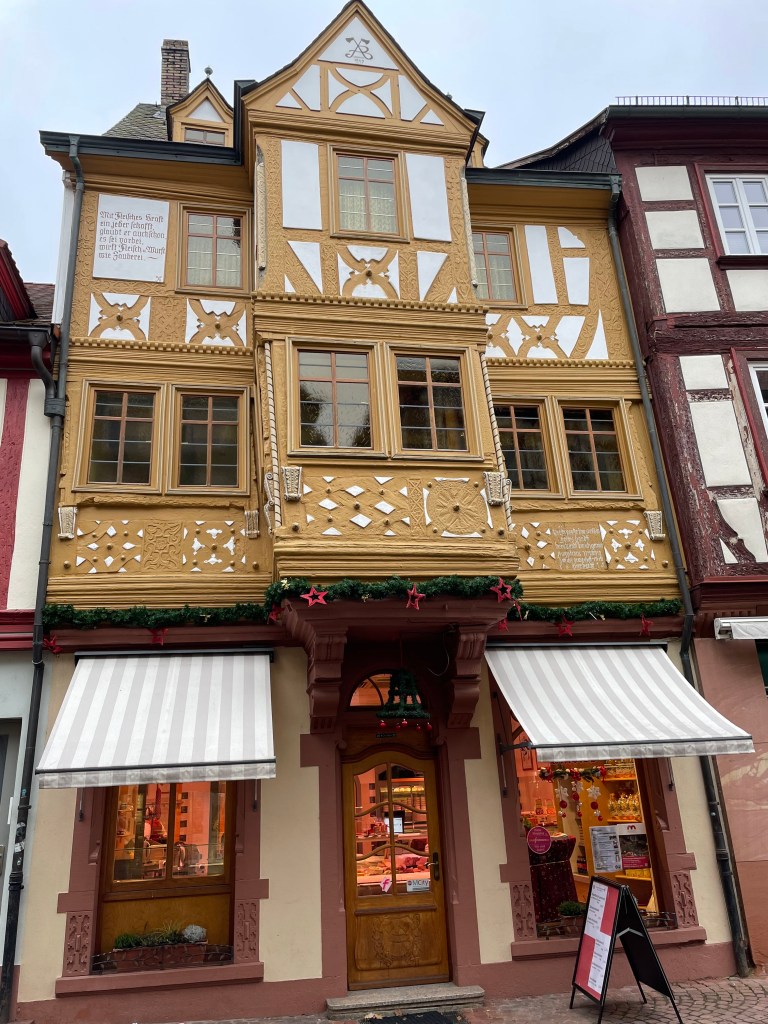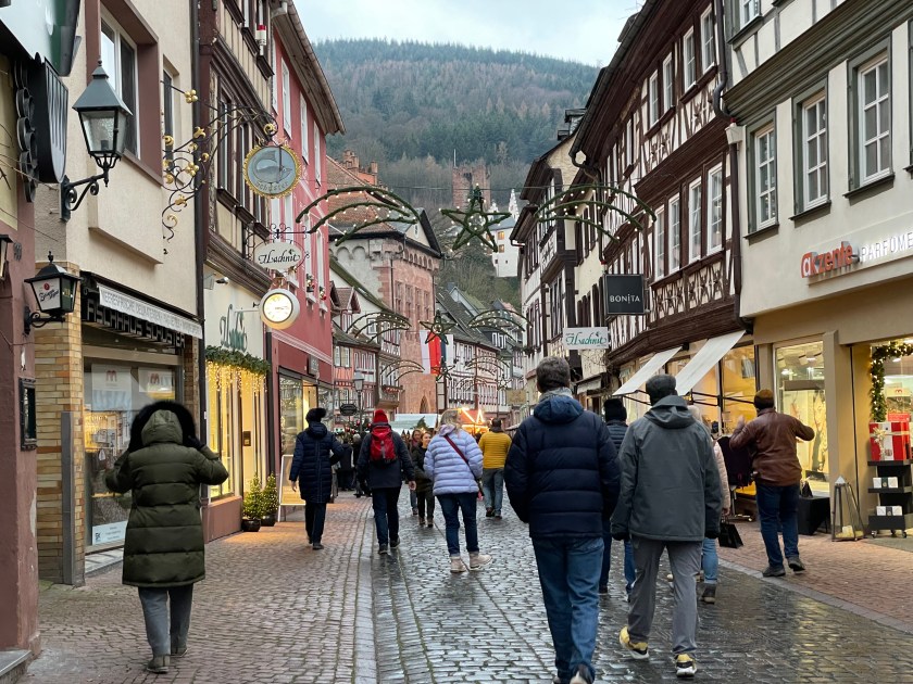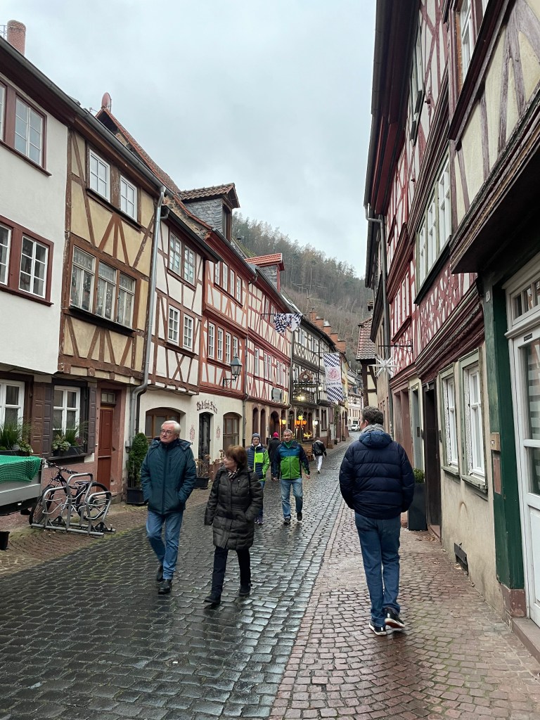 We took the afternoon off to go see two more Christmas markets–Miltenberg and Michelstadt, both about and hour or so from Frankfurt. Miltenberg, our first stop was absolutely delightful. We arrived at about 2:00 and wandered through the town along the main street. There were Christmas market stalls set up along this main street and a few in the small central plaza. It wasn’t what you’d call a large market, but the town was so festive and beautiful, we were really glad to be there during this Christmas season.