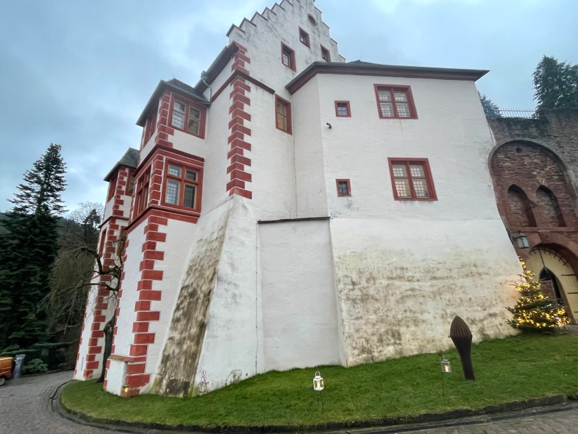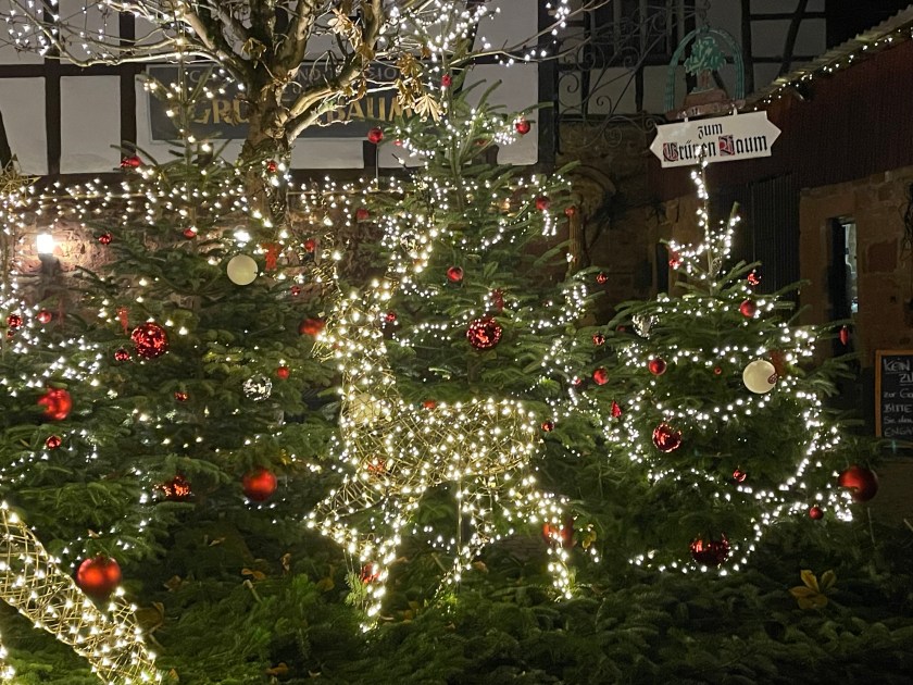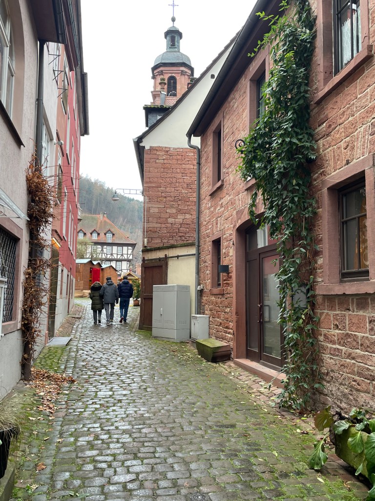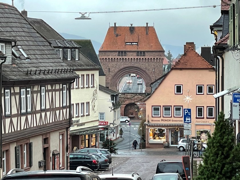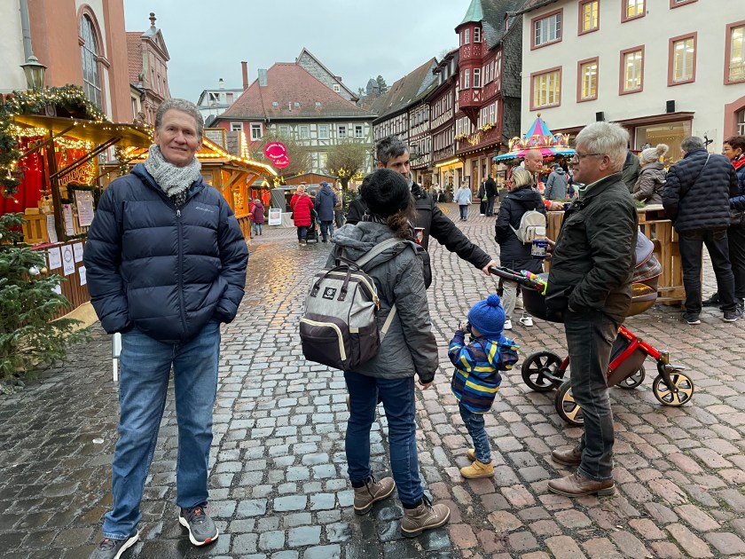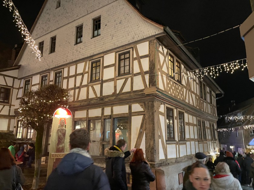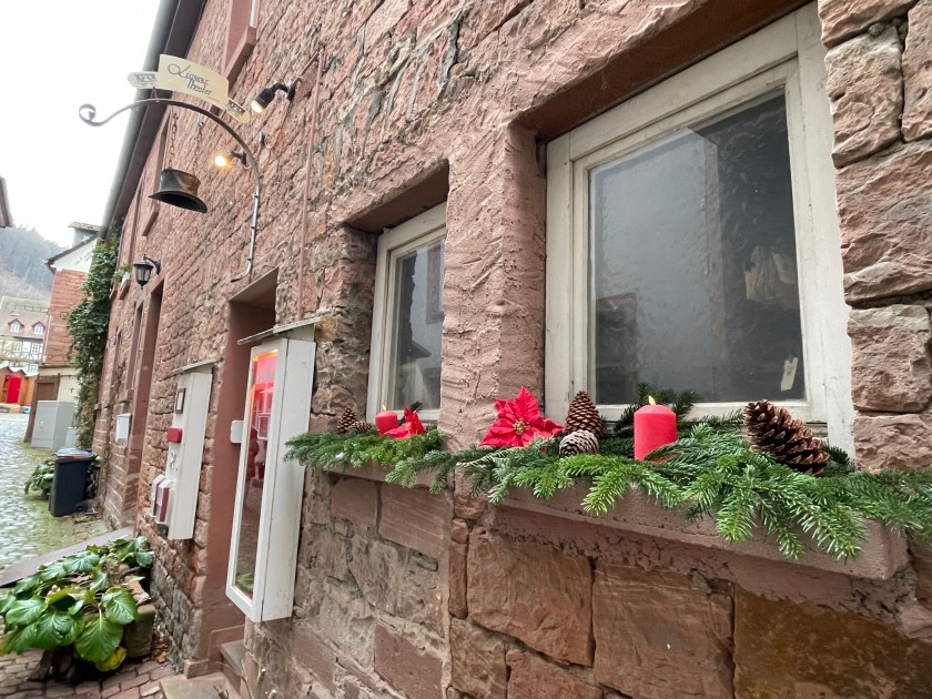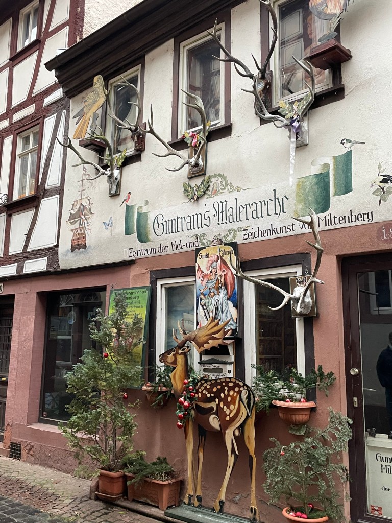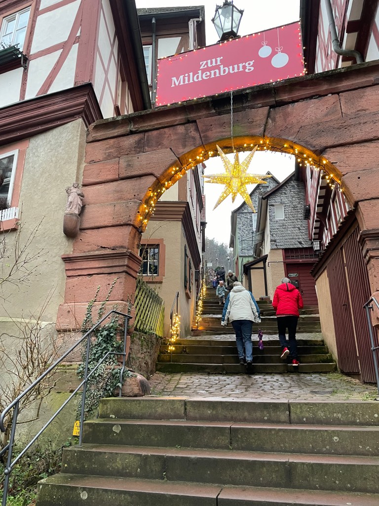 We took the afternoon off to go see two more Christmas markets–Miltenberg and Michelstadt, both about and hour or so from Frankfurt. Miltenberg, our first stop was absolutely delightful. We arrived at about 2:00 and wandered through the town along the main street. There were Christmas market stalls set up along this main street and a few in the small central plaza. It wasn’t what you’d call a large market, but the town was so festive and beautiful, we were really glad to be there during this Christmas season.