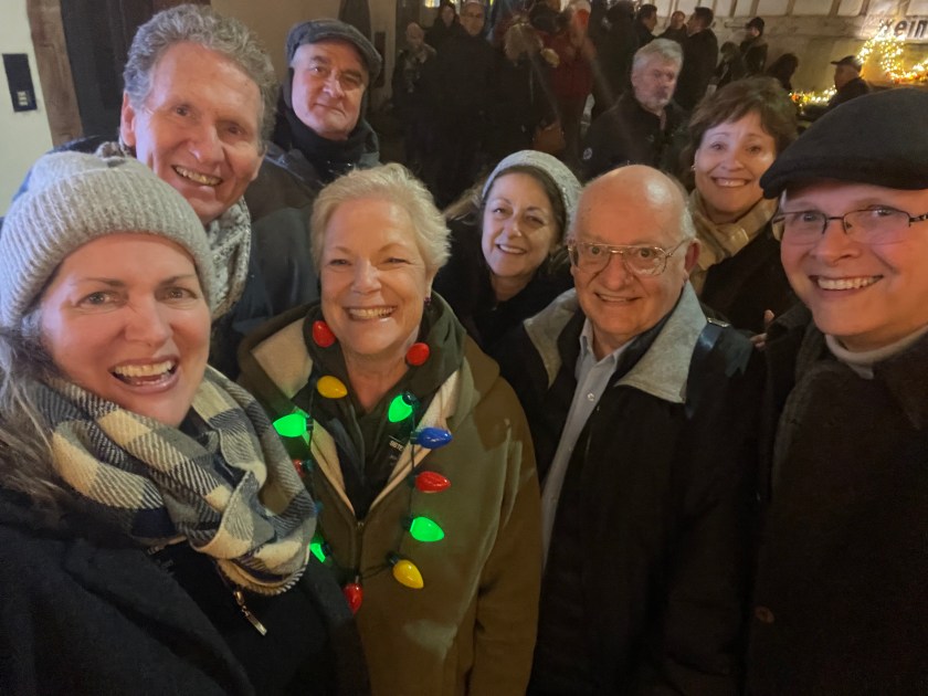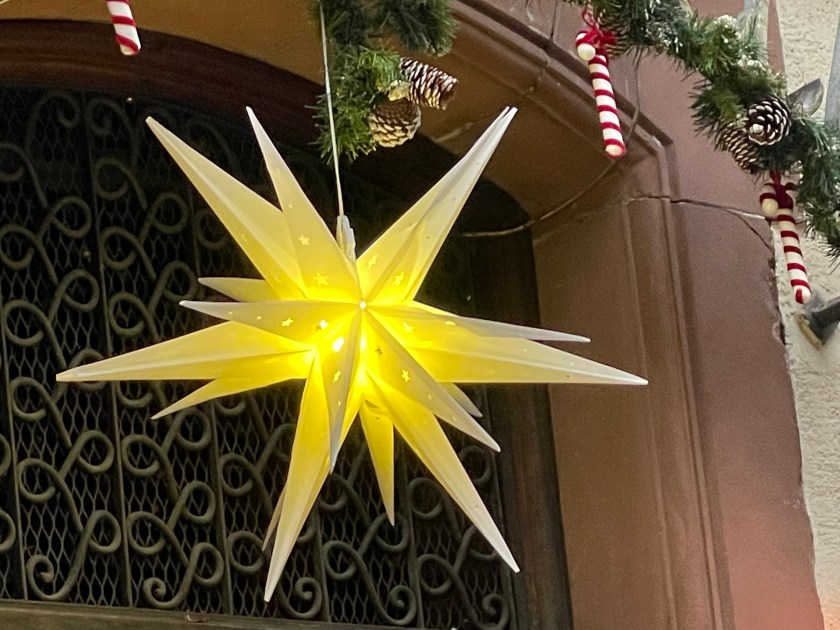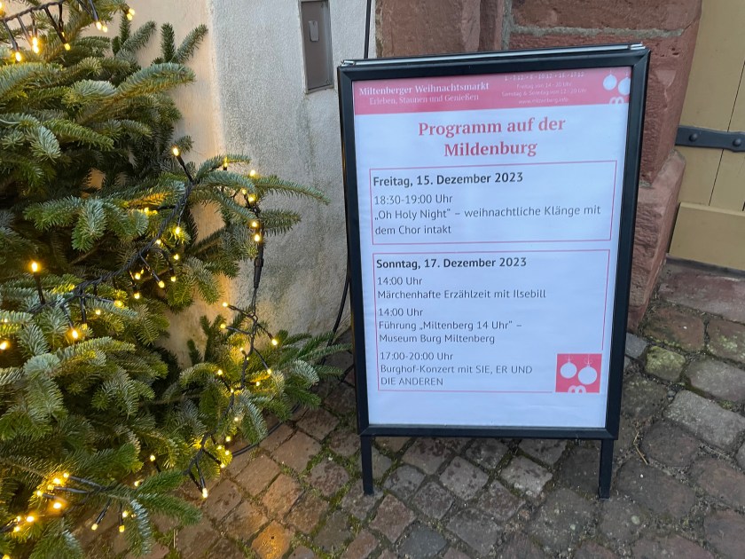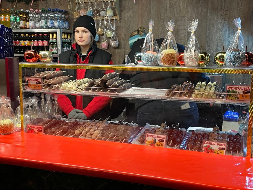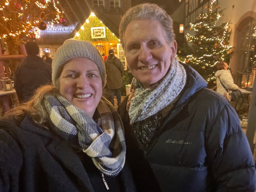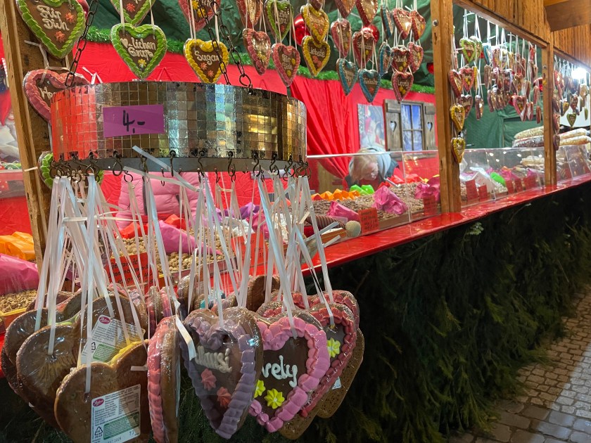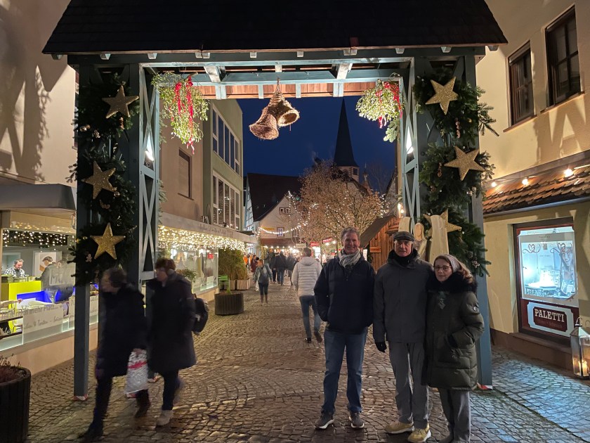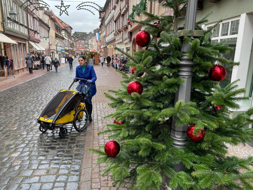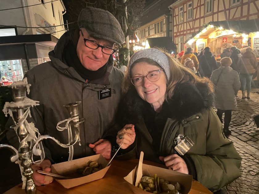 We took the afternoon off to go see two more Christmas markets–Miltenberg and Michelstadt, both about and hour or so from Frankfurt. Miltenberg, our first stop was absolutely delightful. We arrived at about 2:00 and wandered through the town along the main street. There were Christmas market stalls set up along this main street and a few in the small central plaza. It wasn’t what you’d call a large market, but the town was so festive and beautiful, we were really glad to be there during this Christmas season.