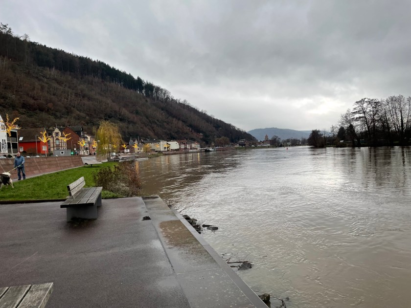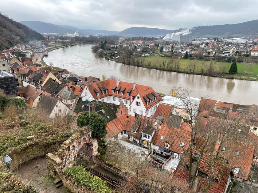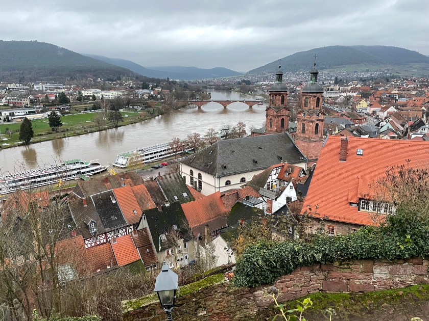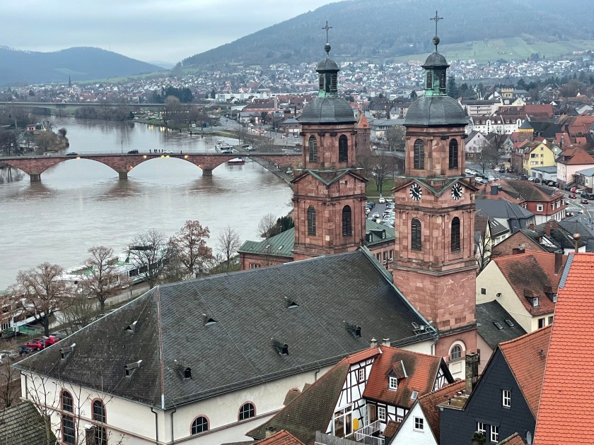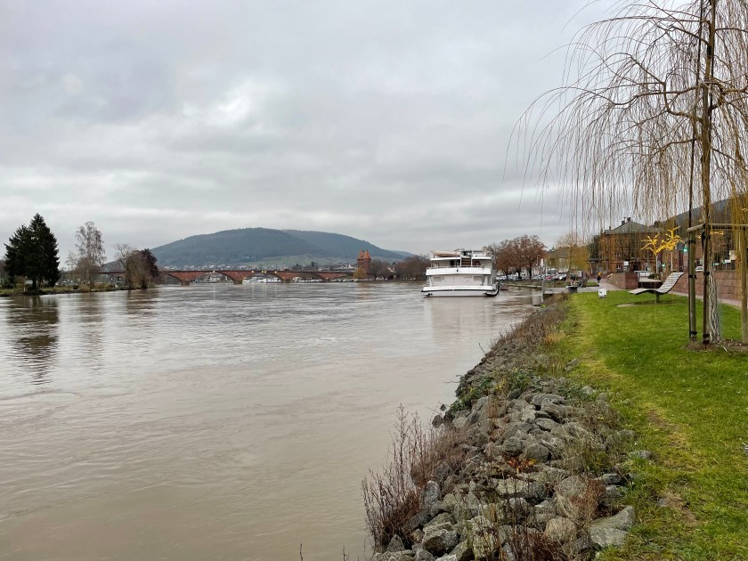 Miltenberg stretches along the Main River. The town is narrow and sits at the foot of a mountainside. The water level of the river was just inches below the town, and there has been flooding here when the river rises.