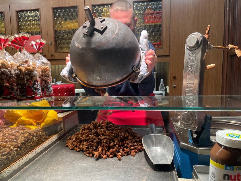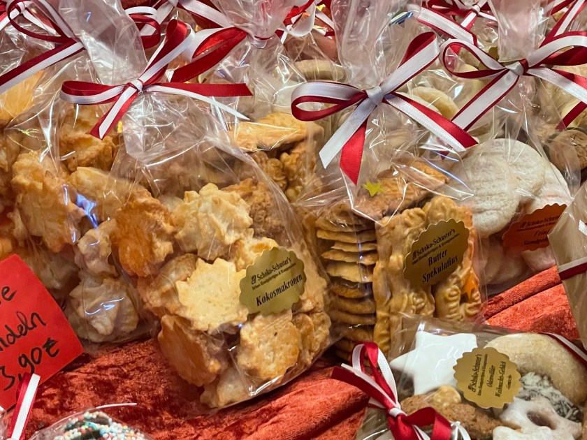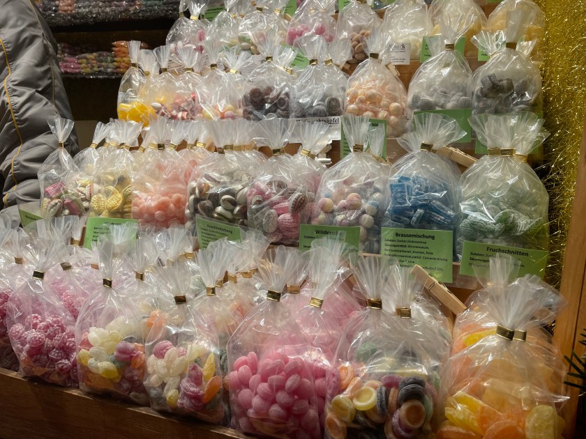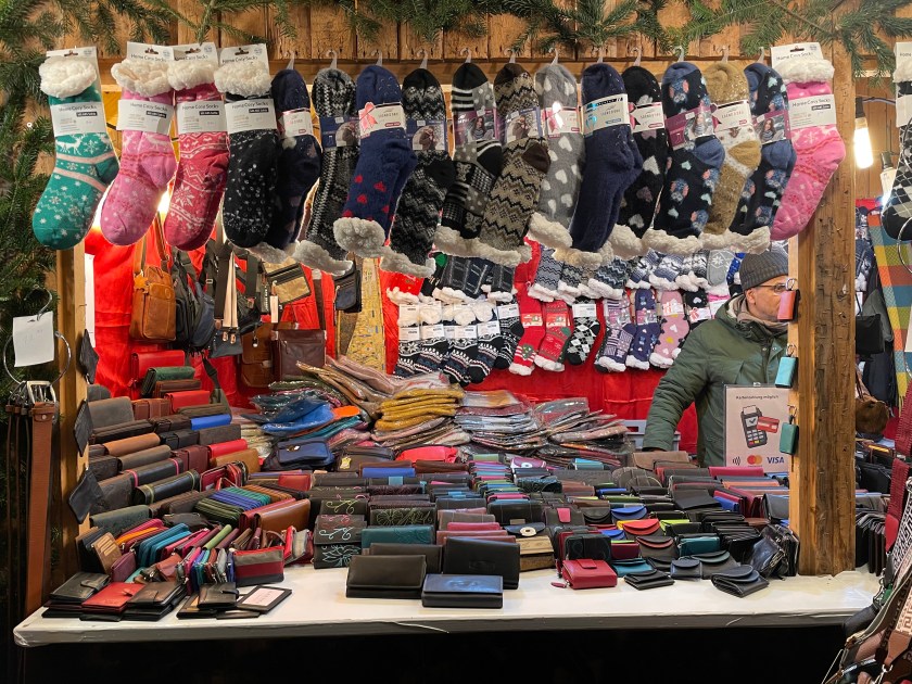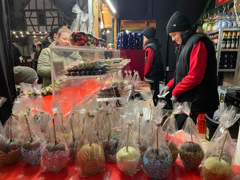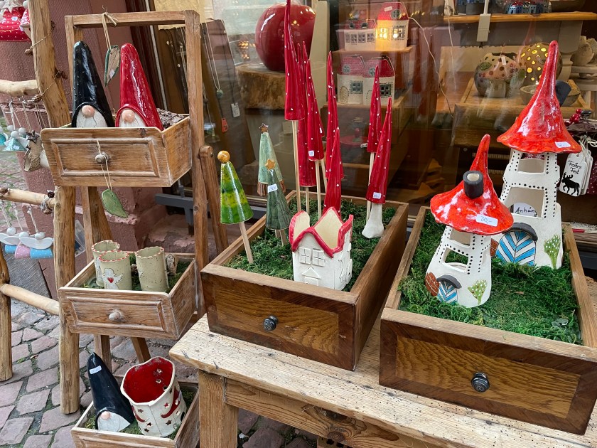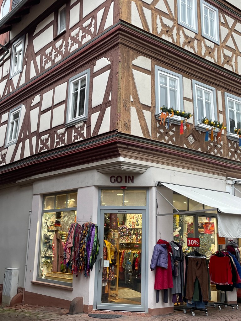 The Christmas Market in Michelstadt is held in the old town. We entered through an old passageway. Once inside, the maret area looped around this part of the old town, mingled with the shops there, which makes it great for the local merchants. All the shops were open and welcome business.