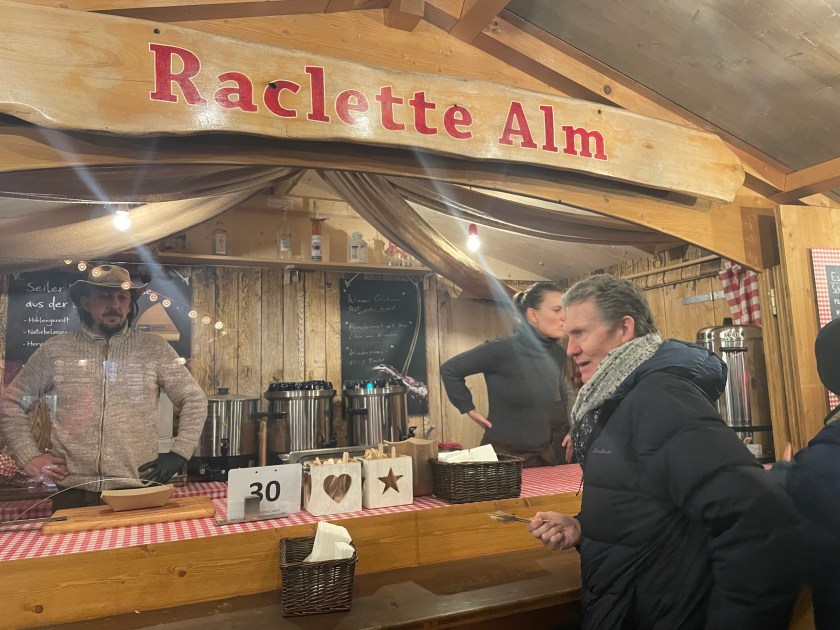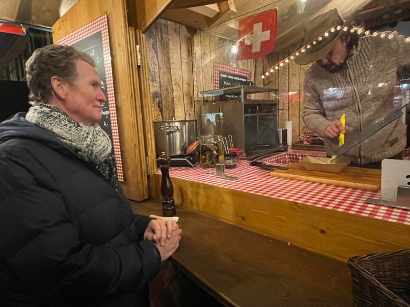 This is what we had for our dinner–John’s favorite, Swiss Raclette, which is Raclette cheese melted under a flame, then scraped into a dish filled with boiled potatoes, pearl onions and little pickles. It was SO SO SO good! (except for the onions, I’ll pass on those)!