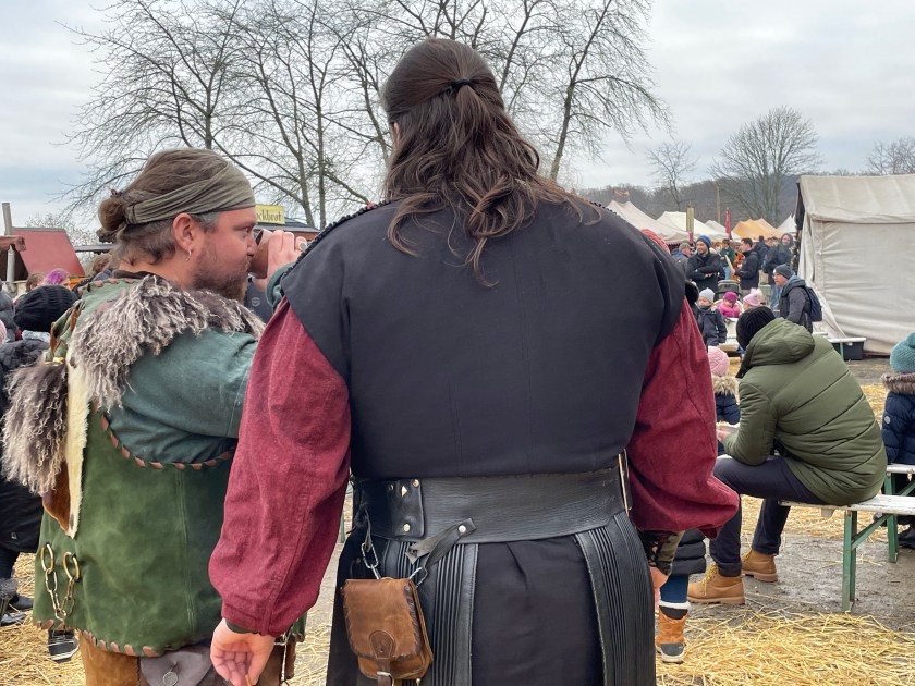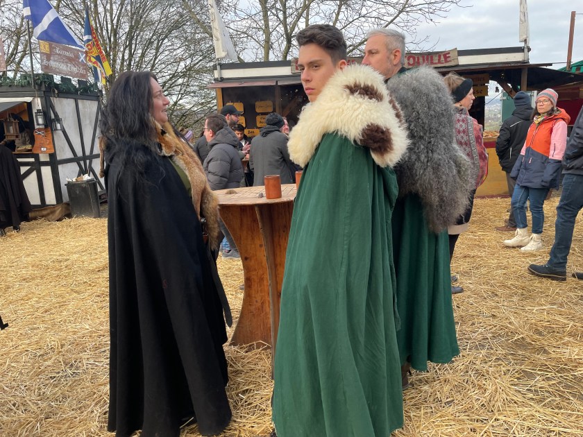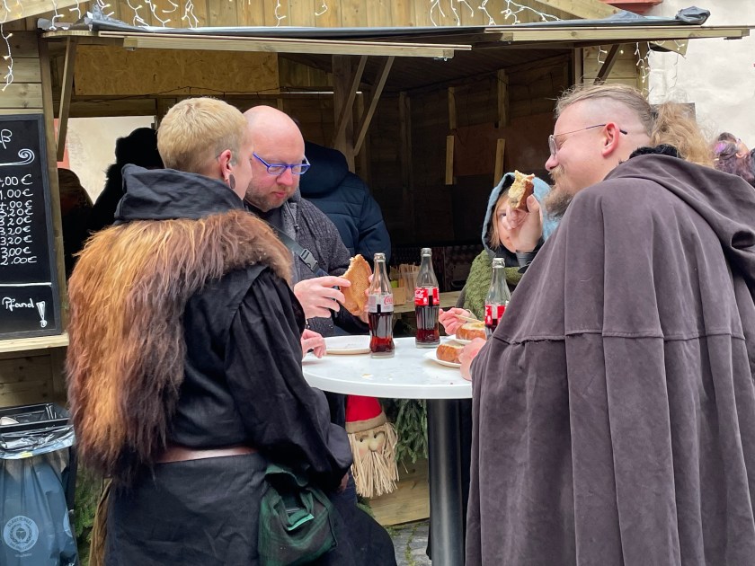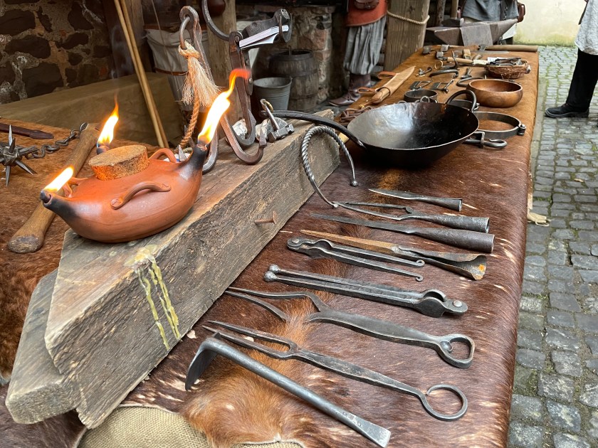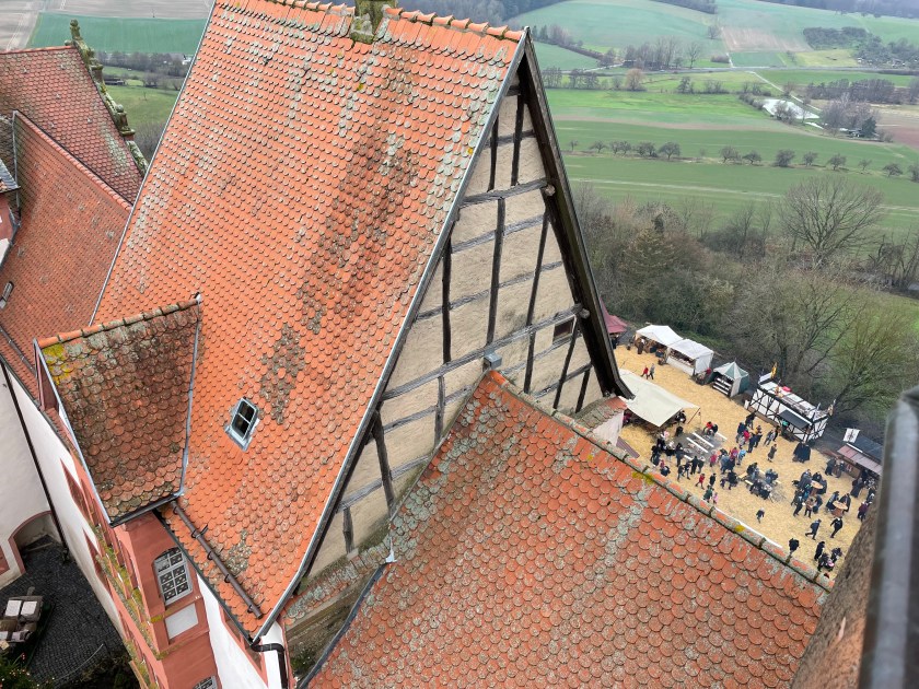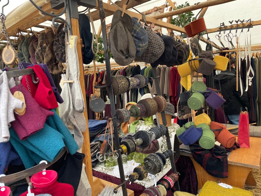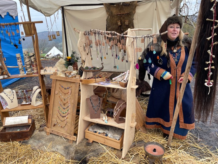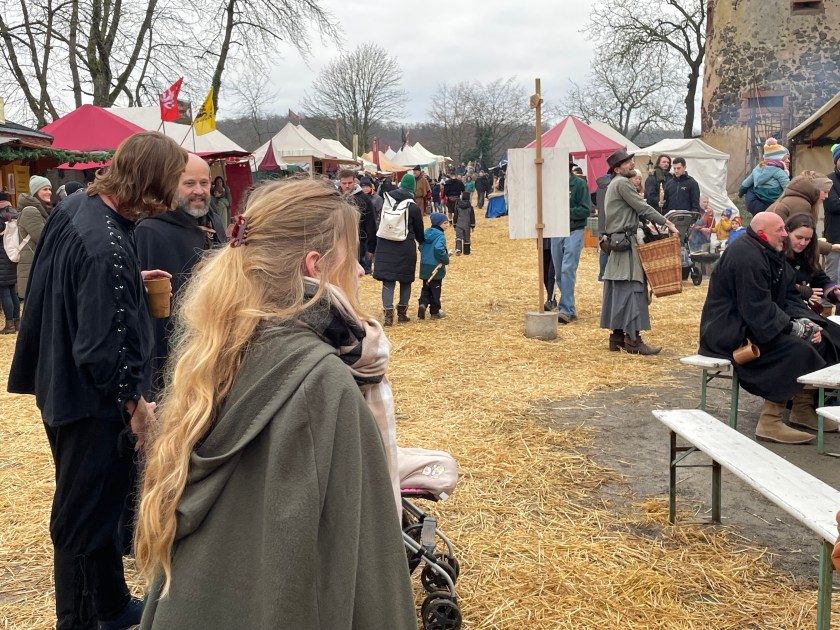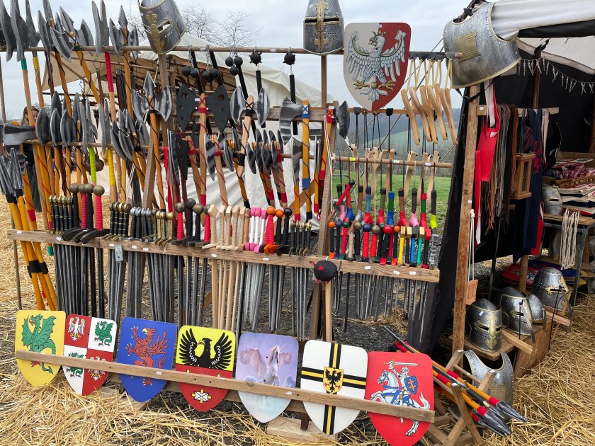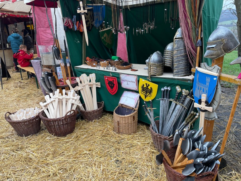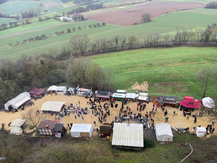 We parked on a muddy hillside of grass, then hiked up the hill to the top where the castle sits on a basalt cone, or rock outcropping. The market had a medieval theme and was in an area at the base of the castle. The ground was covered with straw so it wasn’t muddy.