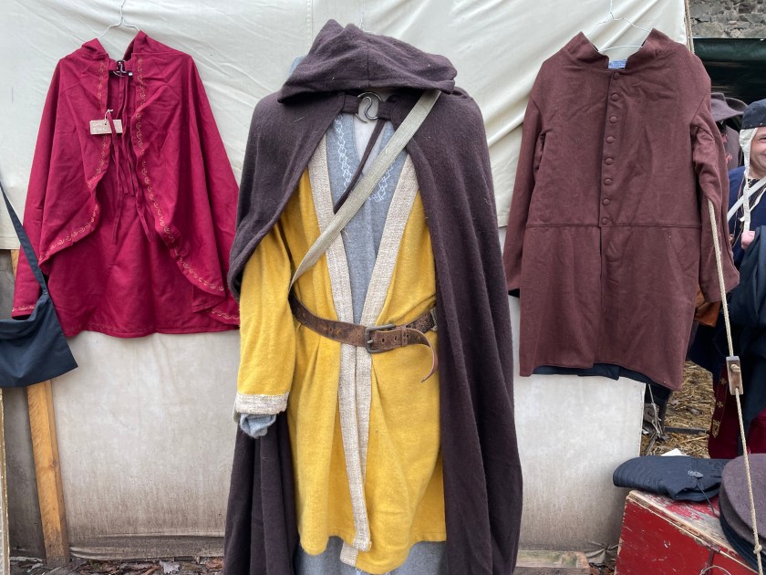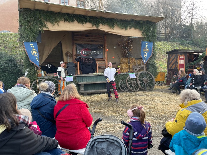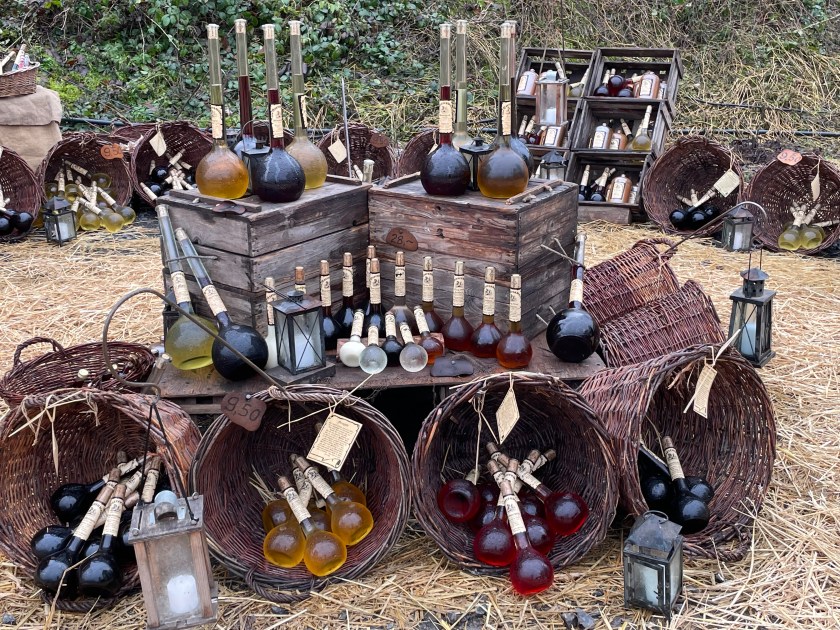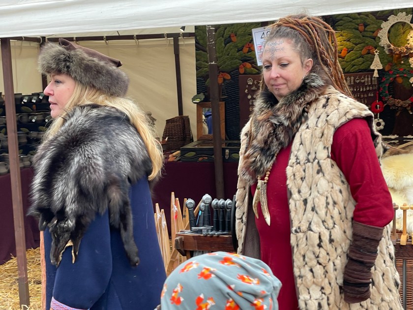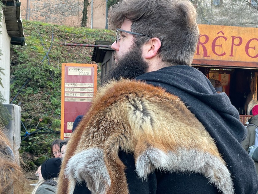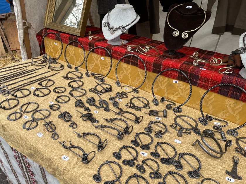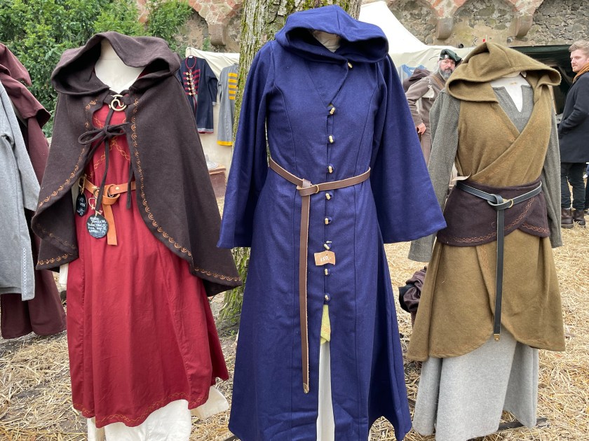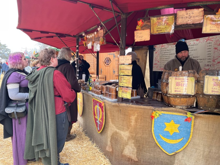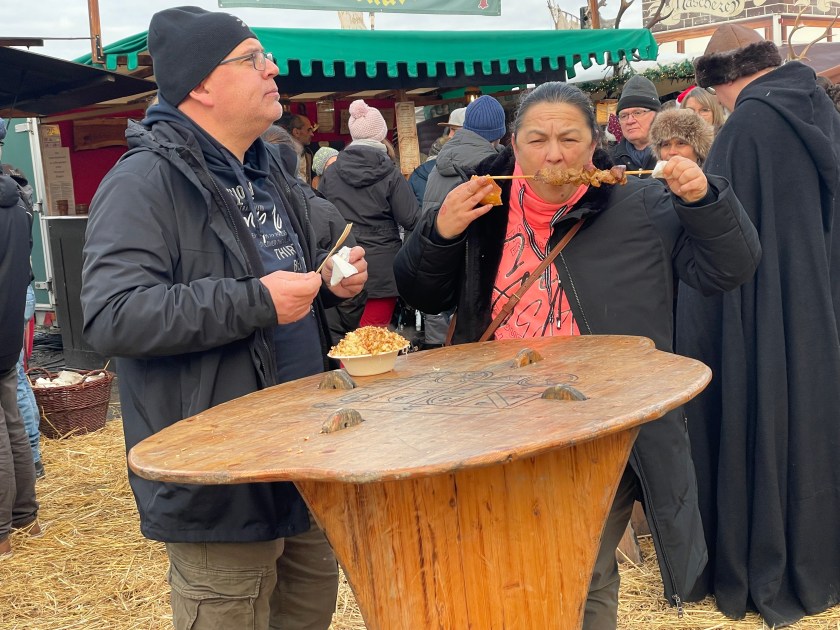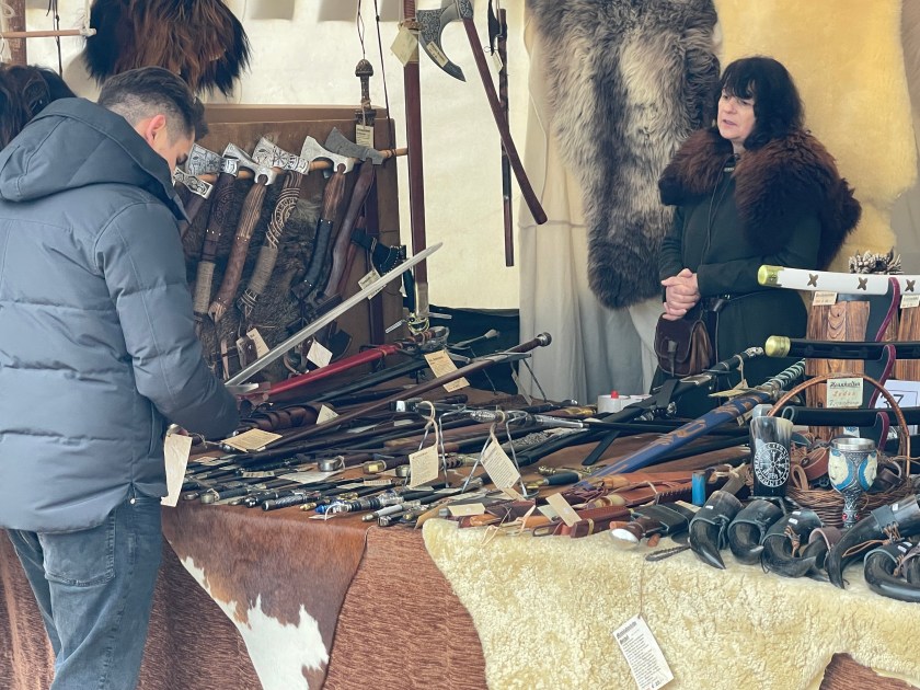 We parked on a muddy hillside of grass, then hiked up the hill to the top where the castle sits on a basalt cone, or rock outcropping. The market had a medieval theme and was in an area at the base of the castle. The ground was covered with straw so it wasn’t muddy.
