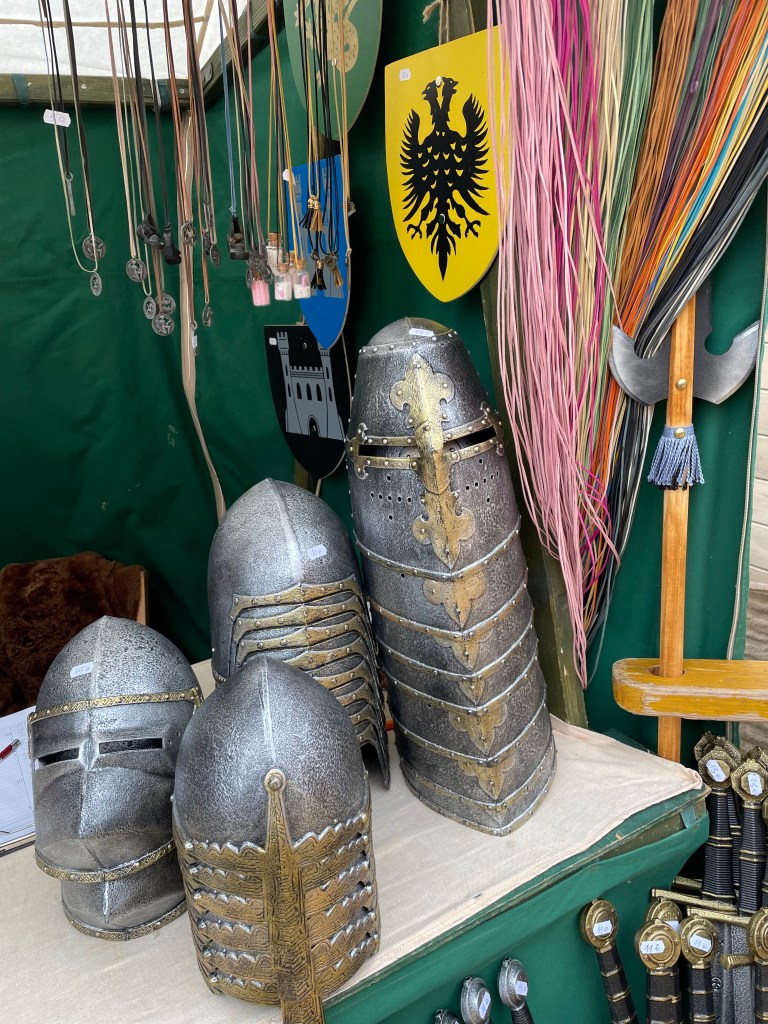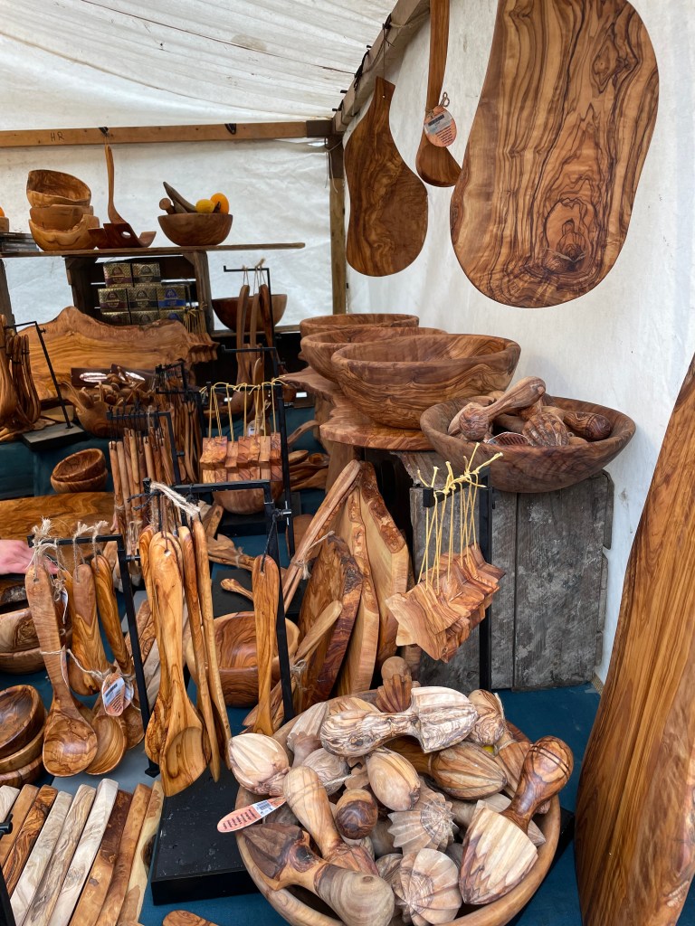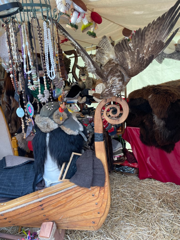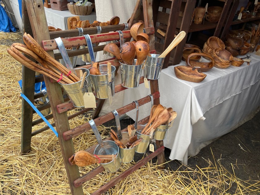 Each little stall or shop had something to do with the theme–clothing, weapons, dress up clothing for children, soaps and candles, lots of jewelry, skins and clothing made from them, belts and caps, scarves, etc. The food was also old world food–Brats and rolls, really delicious freshly made Kase Spaetzle, loaves of artisan bread of every kind, meat grilled on skewers, baked apples, deep fried apple rings (yum), the spiral cut potatoes, crepes, sausages and more.